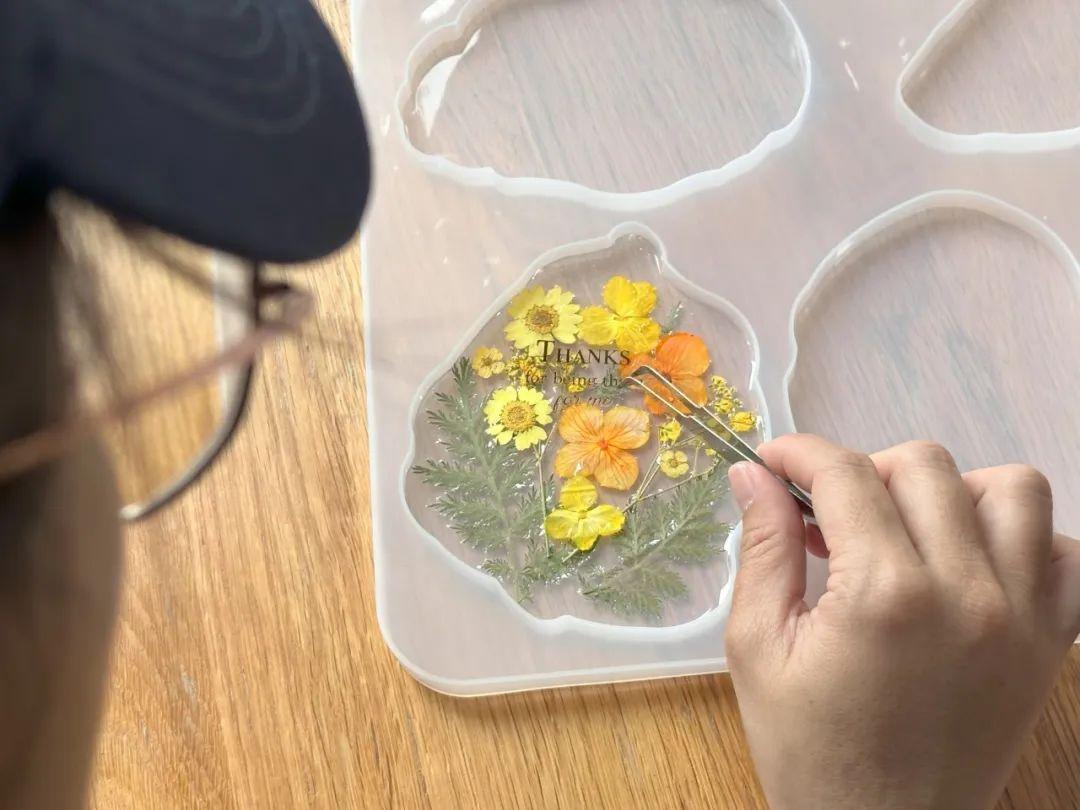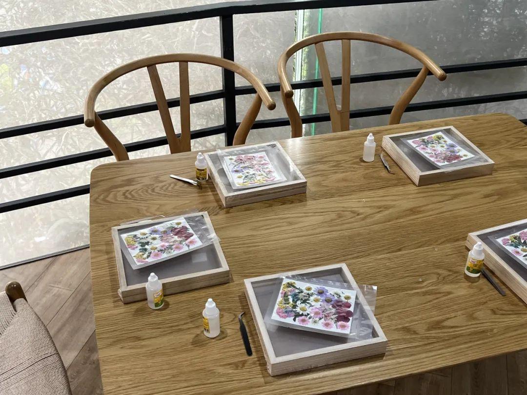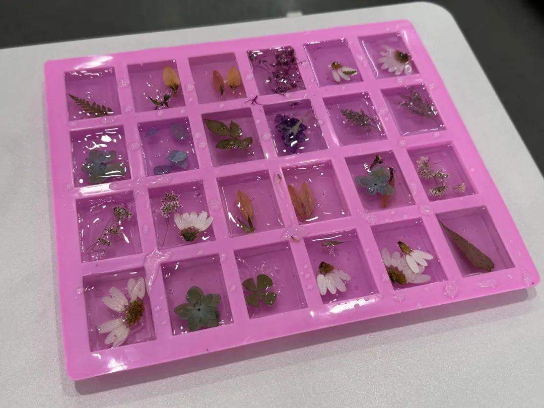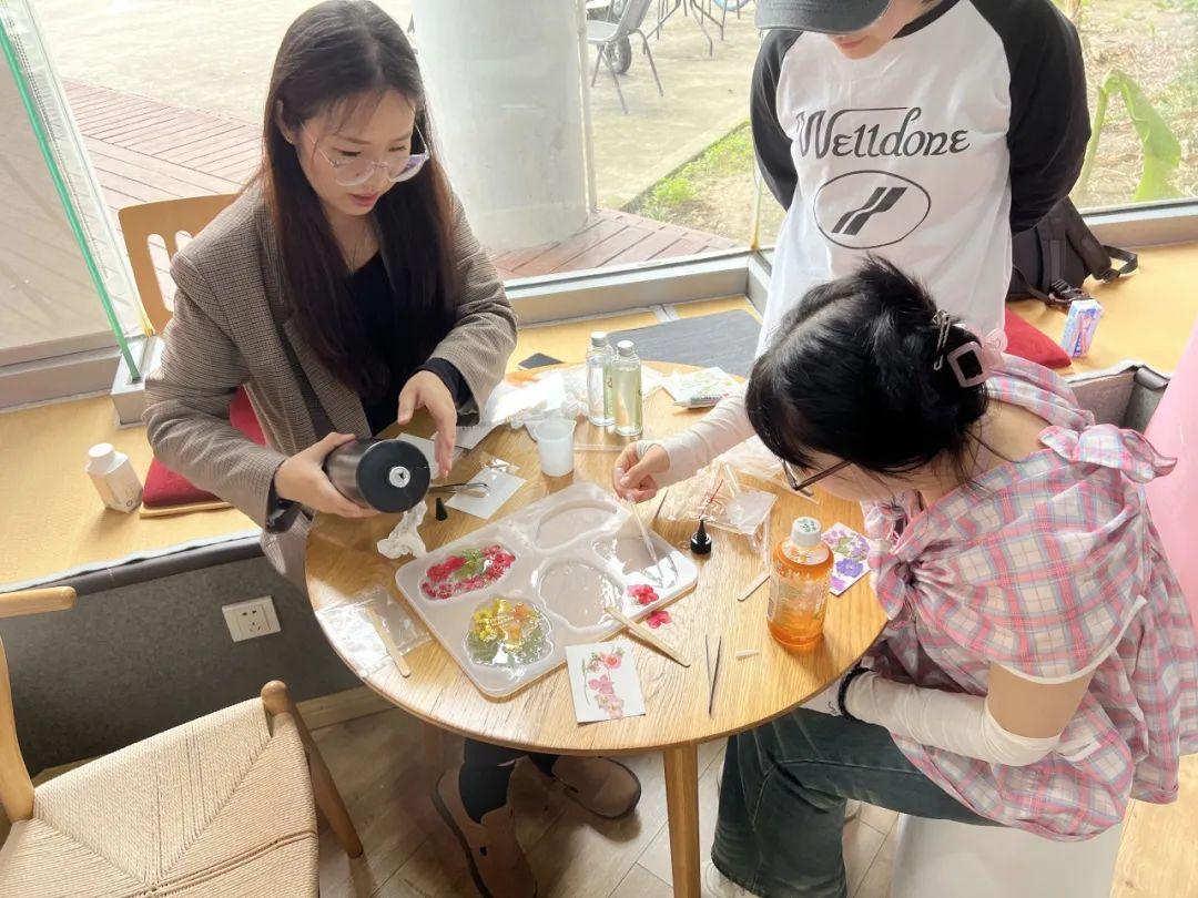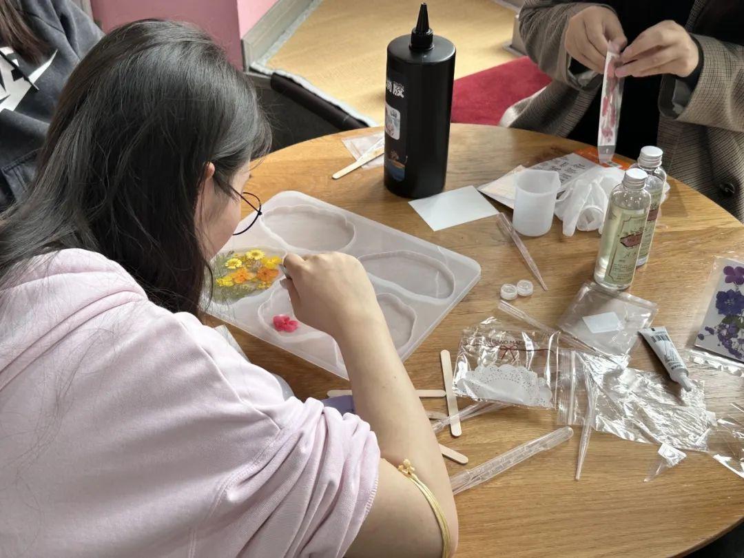 同学们使用树脂将干花固定,制作出既美观又实用的花语杯垫。每位参与者都能带走一件自己亲手制作的艺术品,这些花语杯垫不仅是实用的家居装饰,也是表达个人情感和艺术品味的载体。