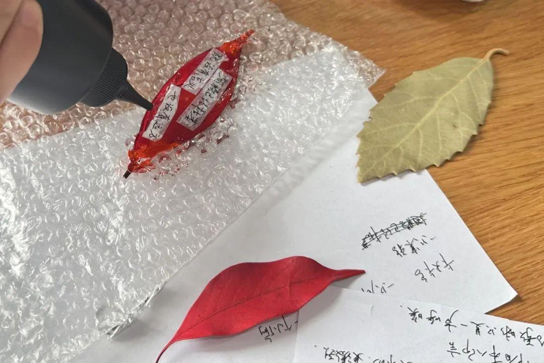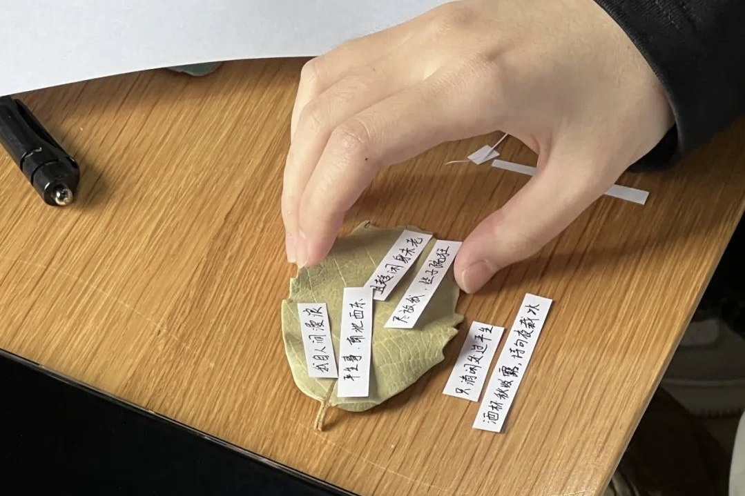 在DIY枯叶拼贴诗活动中,同学们相互交流了基本的拼贴技巧以及如何将枯叶等自然材料与文字结合。随后,同学们选择了各自喜欢的诗句或自创的文字,用枯叶作为背景或装饰,进行艺术创作。参与者用手中的枯叶作为画布,将传统与现代相结合的诗句拼贴其上,用心感受自然材料带来的独特触感和温度。