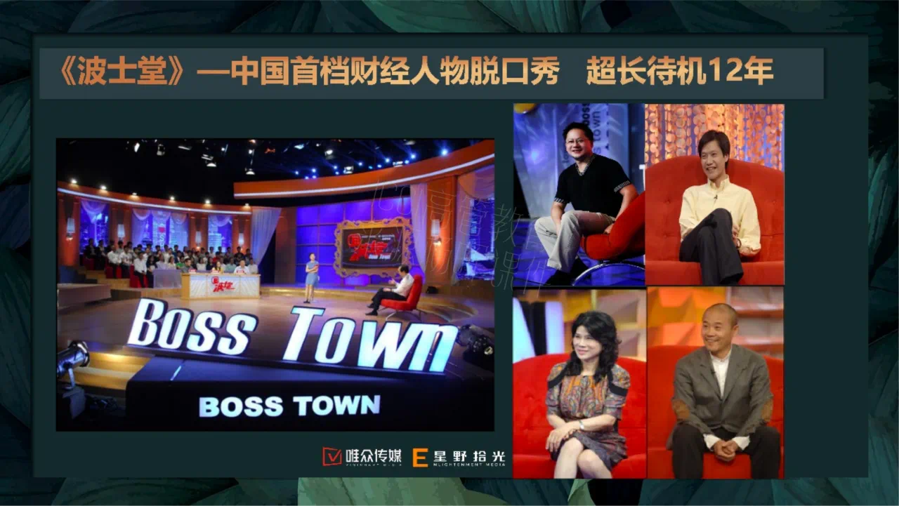 唯众传媒在创业初期面临着制播分离刚刚起步的困境,除了要考虑前期的内容制作所需要的硬件设备、演播厅等设施,还要考虑内容制作出来以后能在哪里播出的问题。第一档节目《波士堂》在第一财经的支持下顺利开播,这档节目邀请到的近600位企业家见证了2006-2018十二年间中国乃至世界经济的发展。于我个人而言,从这些企业家的分享里学到了很多创业所需要的经营管理理念和企业家精神,节目也因此影响了许许多多像我一样的创业者。可见有价值的内容赋能可以是多方面的。