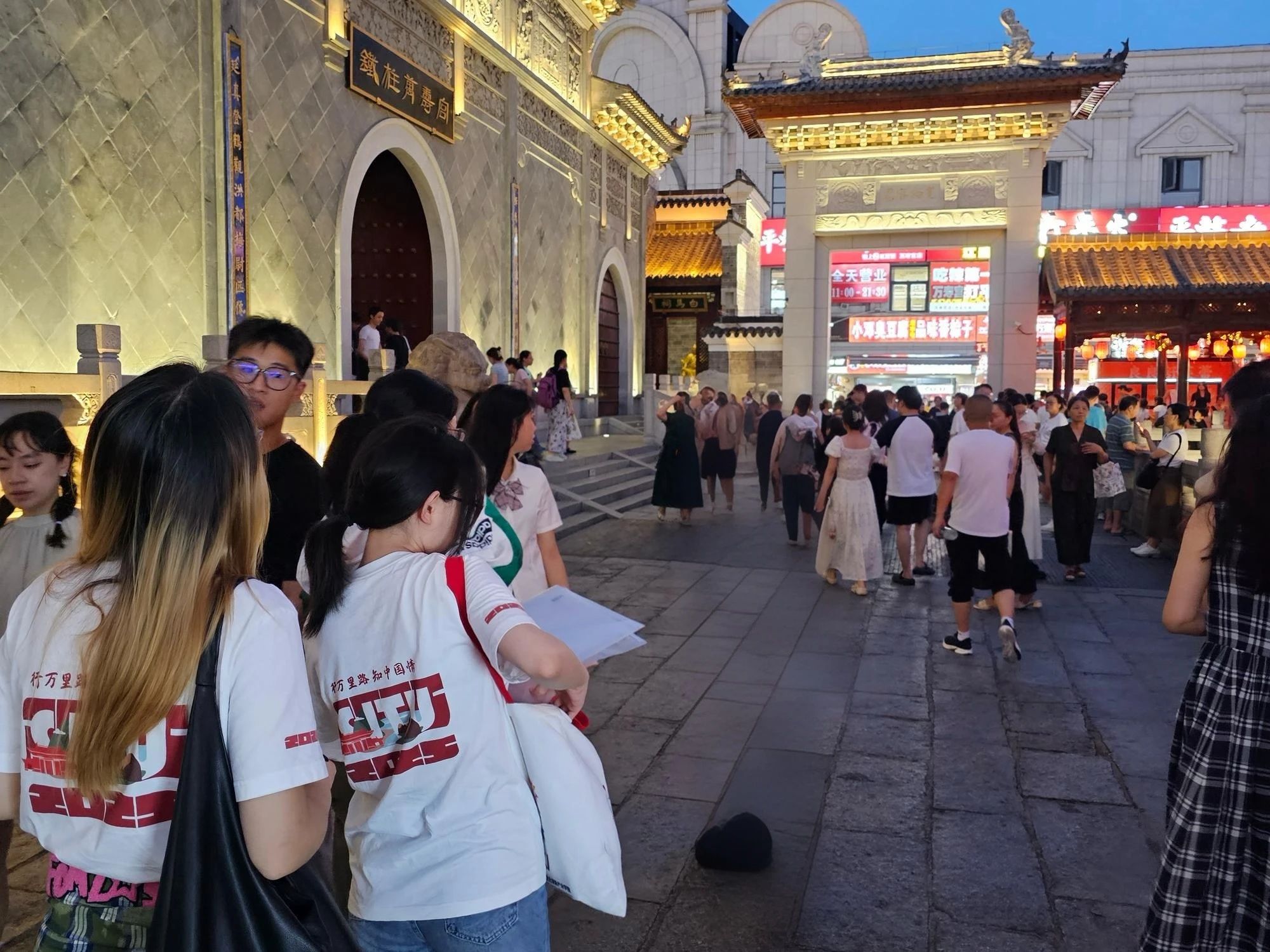 当日傍晚,实践团前往万寿宫历史文化街区继续调研。万寿宫历史文化街区是省级重点文商旅项目。它始建于西晋,最初是为了纪念道教人物许逊,后发展成为天下万寿宫的“祖庭”。实践团在6月的初步实地调研中发现,万寿宫不仅是南昌游客必经打卡点,也是南昌本地年轻人购物度假的好去处。因此调研组此行选择万寿宫作为第二个调研地点,并在此地同步发放问卷。