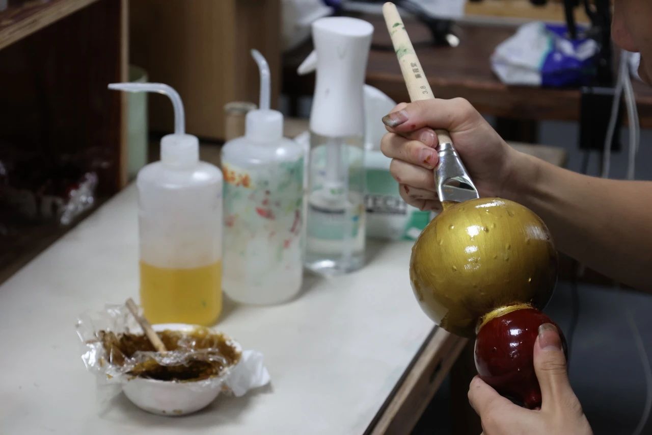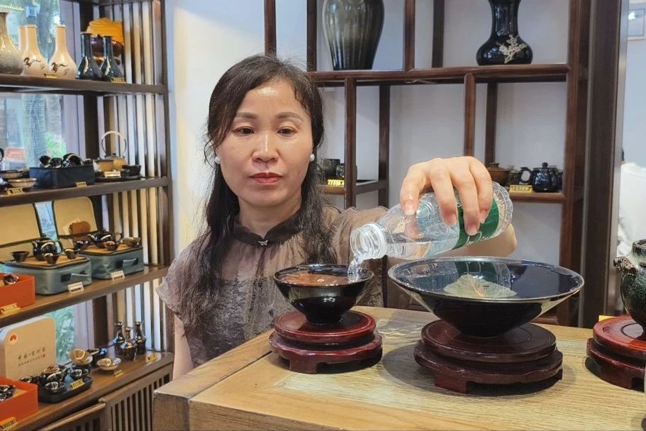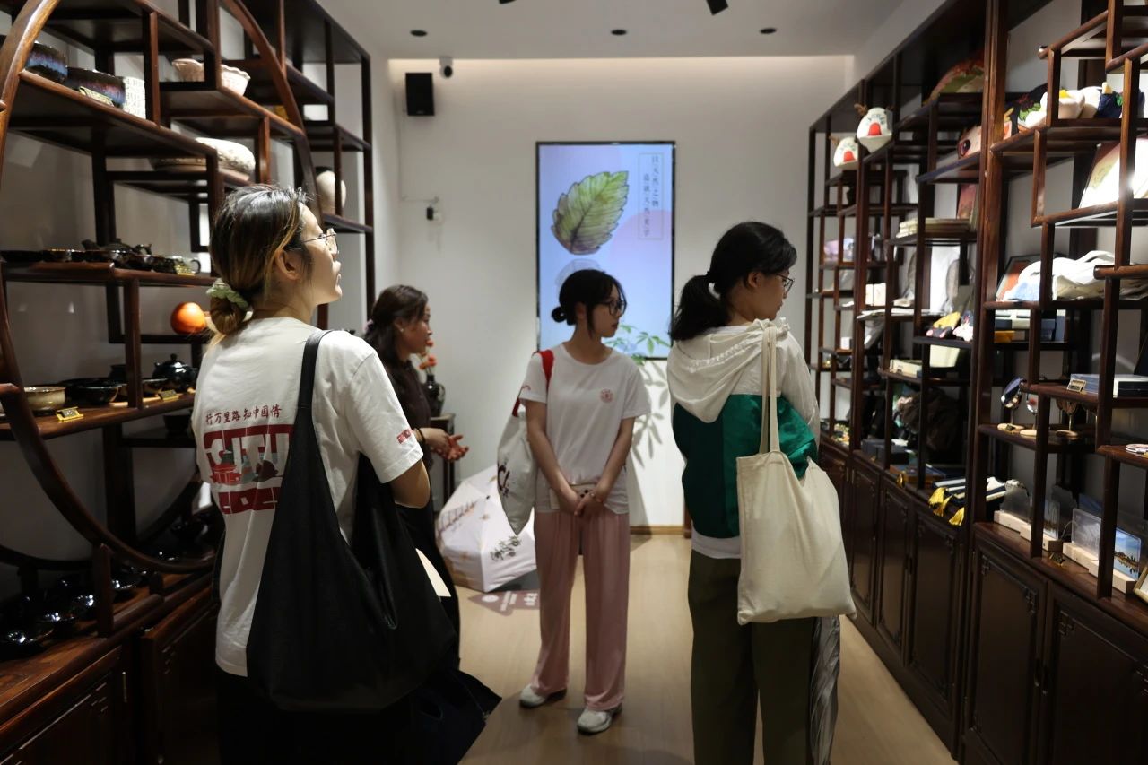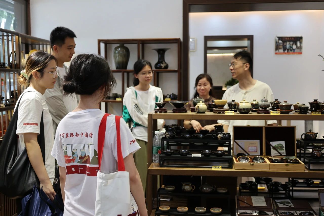 实践团重点关注吉州窑遗址公园运营情况,走访管理处并了解其业态布局。经相关负责人介绍,公园的业态主要分为两个部分:一是龙窑遗址、博物馆等核心文化展示区,二是陶艺工坊、文创商店等体验消费区。在文创商店内,商店负责人详细地向实践团介绍了吉州窑的核心产品“木叶盏”,讲解木叶盏“一片叶子一盏茶”的独特原理——经过特殊处理的天然树叶被贴在素坯上入窑烧制,叶片燃尽后,其脉络纹理便会永久留存于盏面,形成独一无二的装饰。讲解过程中,负责人为实践团演示了木叶盏在使用过程中的视觉效果,当水注入盏中,杯中叶纹仿佛漂浮、舒展开来,视觉效果鲜活灵动。
