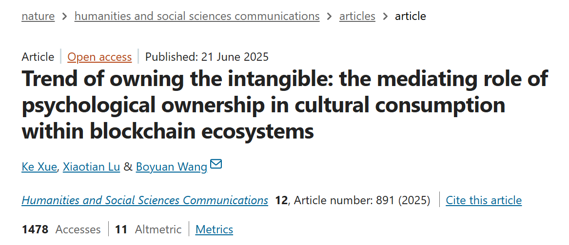 欧宝app官方网站下载薛可教授研究团队在nature子刊《Humanities & Social Sciences Communications》发表最新研究性文章Trend of owning the intangible: the mediating role of psychological ownership in cultural consumption within blockchain ecosystems。