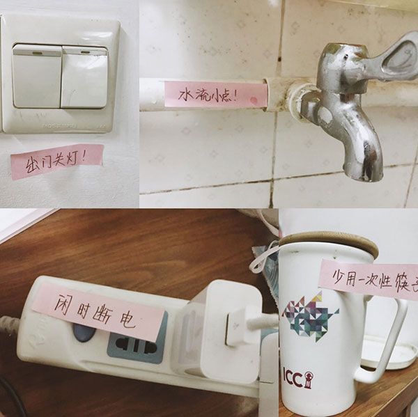 部分同学还在寝室里贴上了节水节电的标签,时刻提醒自己注意节约能源,保护家园。