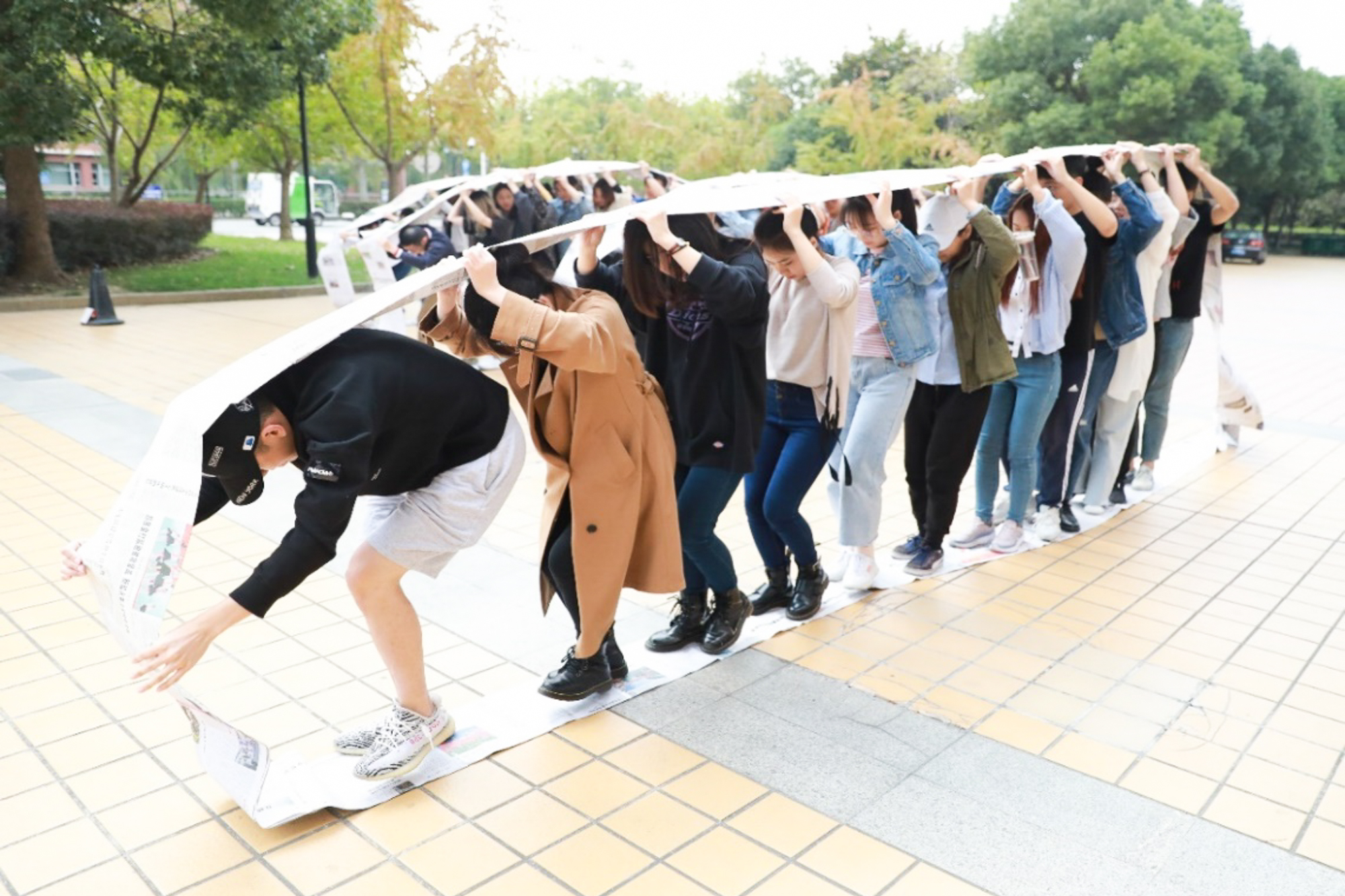 团队组建完成后,在培训师的指导下同学们参加了“无敌风火轮”项目,该项目要求各小组通过团队协作,利用有限的道具,制作能容纳组内所有人前进的“风火轮”,并顺利抵达终点完成挑战。这一环节中,小组成员们集思广益,文创学院的同学们更是充分发挥自身专业优势,大显身手,为制作出高质量的履带出谋划策。比赛场面热闹非凡,大家全情投入,享受比赛乐趣的同时再次切身体会到了团队合作的重要性。最终通过成员们的共同努力,5个小组都顺利地完成了本轮的挑战。