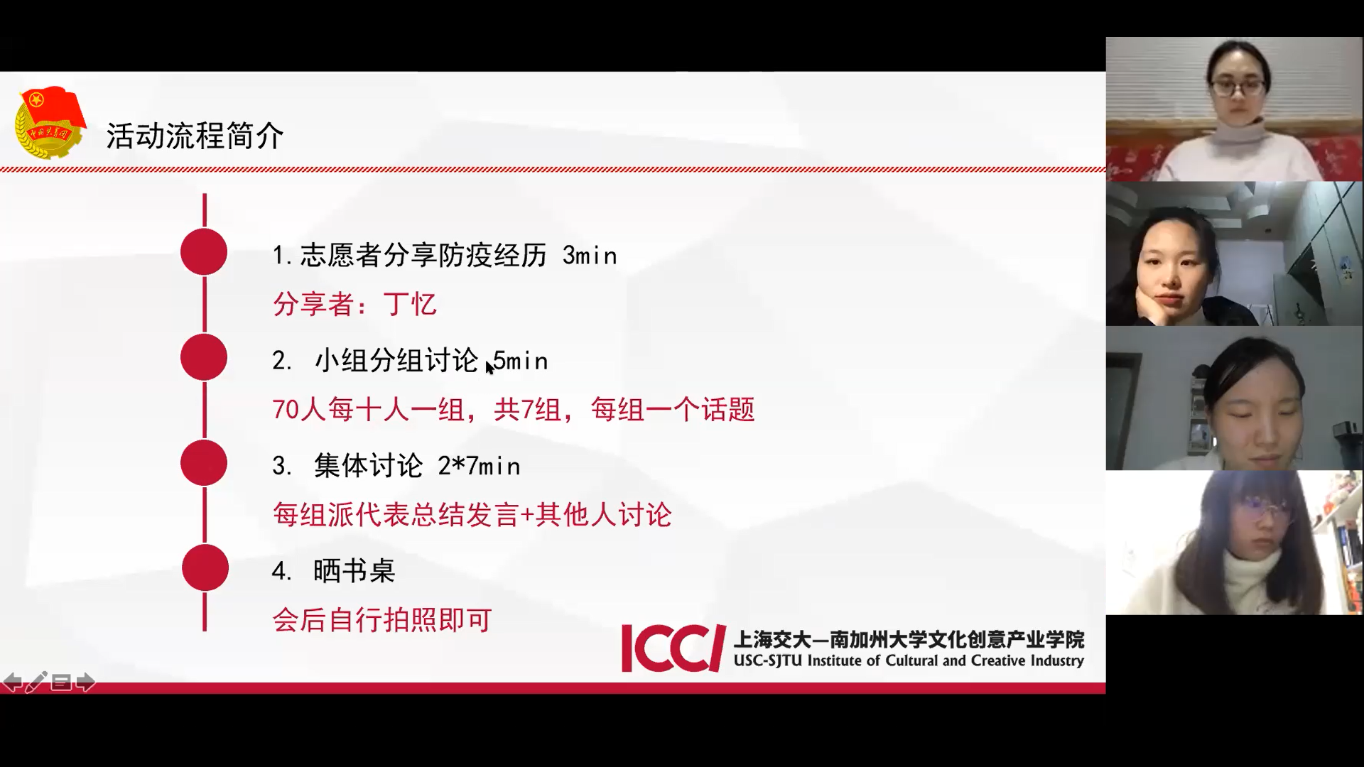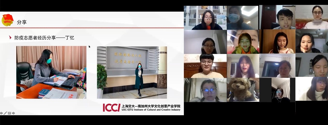 随后,丁忆同学与大家分享了她在她在防疫一线实地参加防疫工作的经历。“哪怕我深知个人能力有限,我能够做的也只不过是微乎其微的事情,可无论如何,作为一名青年学生党员,我绝不能只简单充当这场战疫的‘旁观者’。”在疫情爆发后,丁忆同学第一时间主动联系了家乡常熟市交通局,志愿申请在疫情期间义务工作。在此后的整个过程中,她更加深刻地认识到了“中共党员”“交大人”“文创学子”“未来新媒体人”…… 这些光鲜标签的背后更多代表的是沉甸甸的社会责任和青年人应有的担当。丁忆同学的分享引起了同学们的共鸣,大家对她表示钦佩和支持,也希望她在志愿工作中注意防护,保重安全。