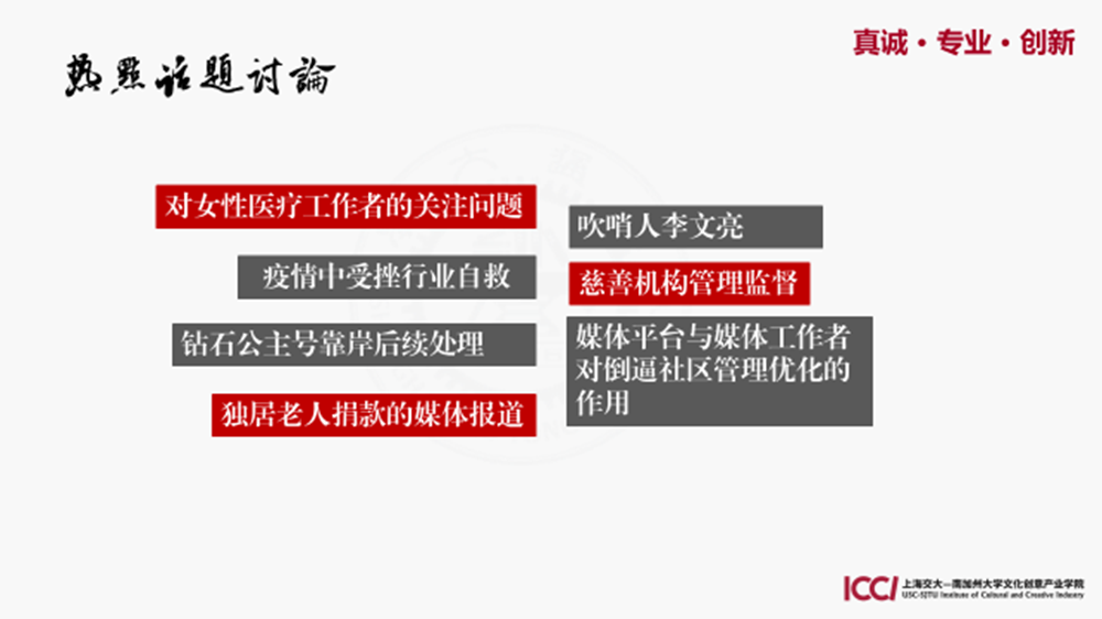 接下来进入到此次团日活动的第三个环节“抗疫话题之我见”。联合团支部根据当下舆论关注和讨论的热点,挑选出了7个话题进行分组讨论。在各自小组讨论交流完毕后,每组代表依次分享,大家就热点话题各抒己见,从而进一步加深了对新闻传播专业的学习者及未来新媒体从业人员所应承载责任的思考与理解。