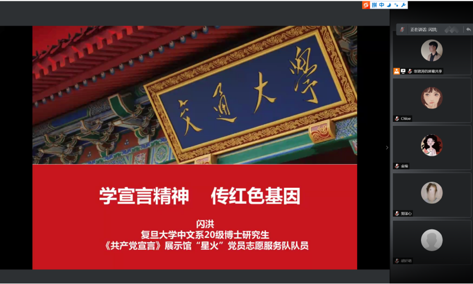 在中国共产党成立一百周年之际,为着力提高文创学子的理论素质和党性修养,在院内营造爱党荣党的积极氛围,2021年4月29日晚,文创学院研究生会举办了《共产党宣言》学习交流活动。本次活动以“学宣言精神 传红色基因”为主题,邀请复旦大学《共产党宣言》展示馆“星火”党员志愿服务队队员闪洪作为主讲人进行分享,17名院内各年级学生代表参加活动,交流会由研究生会主席团成员费凯澜主持。