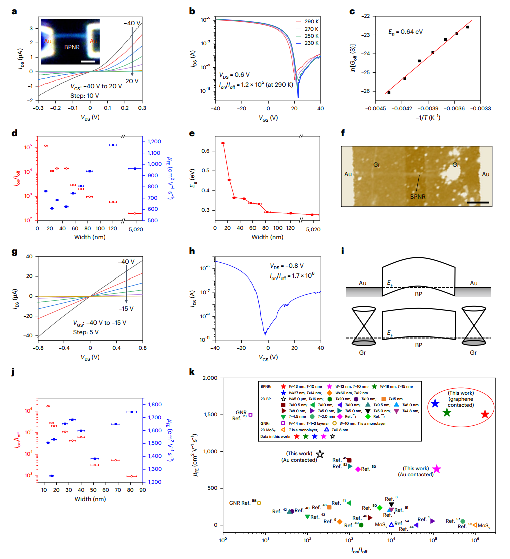 金接触(a-e)和石墨烯接触(f-j)的黑磷纳米带场效应晶体管的特性及其与基于其它一维和二维材料的场效应晶体管性能的比较(k)