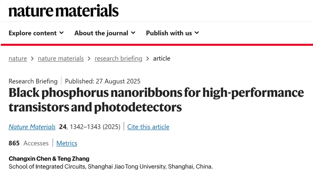同时该工作也被《Nature Materials》选为突出科研成果,以“Black phosphorus nanoribbons for high-performance transistors and photodetectors”(黑磷纳米带用作高性能晶体管和光电探测器)为题在“Research Briefing”栏目专题报道。