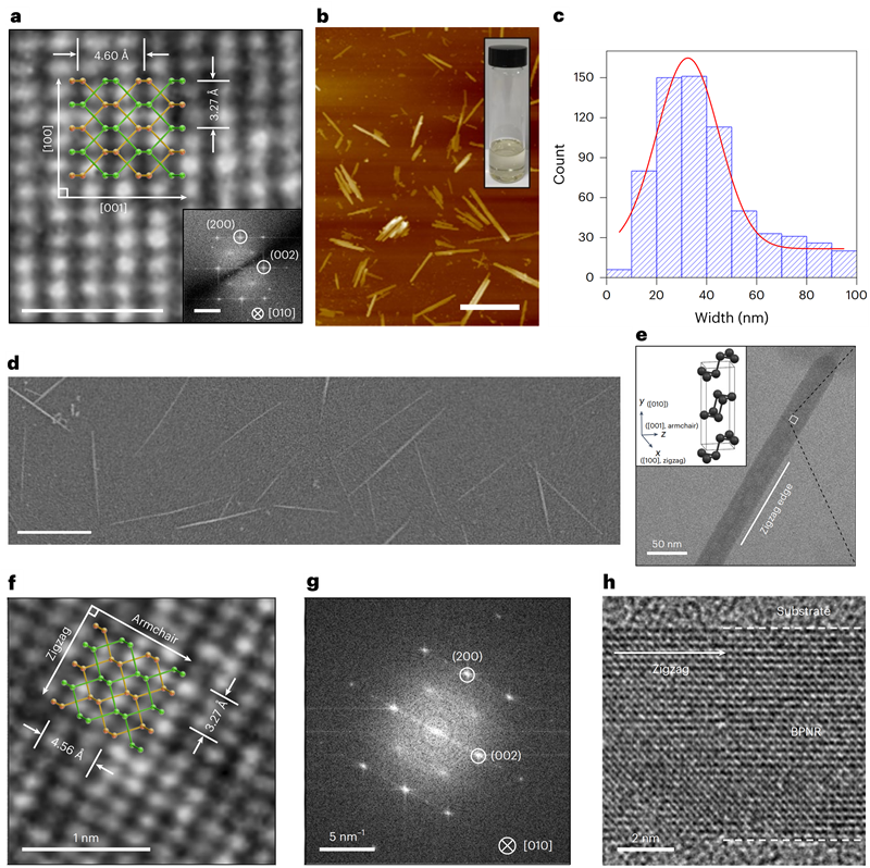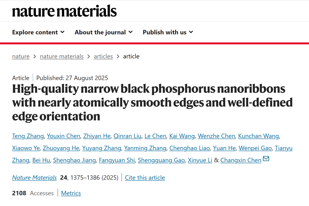 近日,欧宝app官方网站下载集成电路学院(信息与电子工程学院)陈长鑫教授研究团队在具有近原子级光滑边缘和明确边缘取向的高质量窄型黑磷纳米带的制备及其高性能场效应晶体管和光电探测器应用研究方面取得了重要进展。相关成果以“High-quality narrow black phosphorus nanoribbons with nearly atomically smooth edges and well-defined edge orientation”(具有近原子级光滑边缘和明确边缘取向的高质量窄黑磷纳米带)为题发表在《Nature Materials》上。
