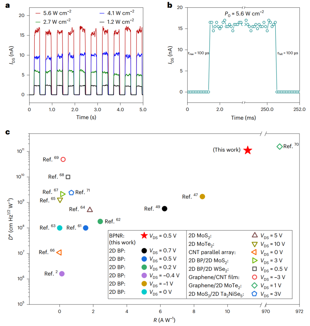 黑磷纳米带光电探测器特性(a-b)及其与其它基于一维和二维材料的光电探测器性能的比较(c)