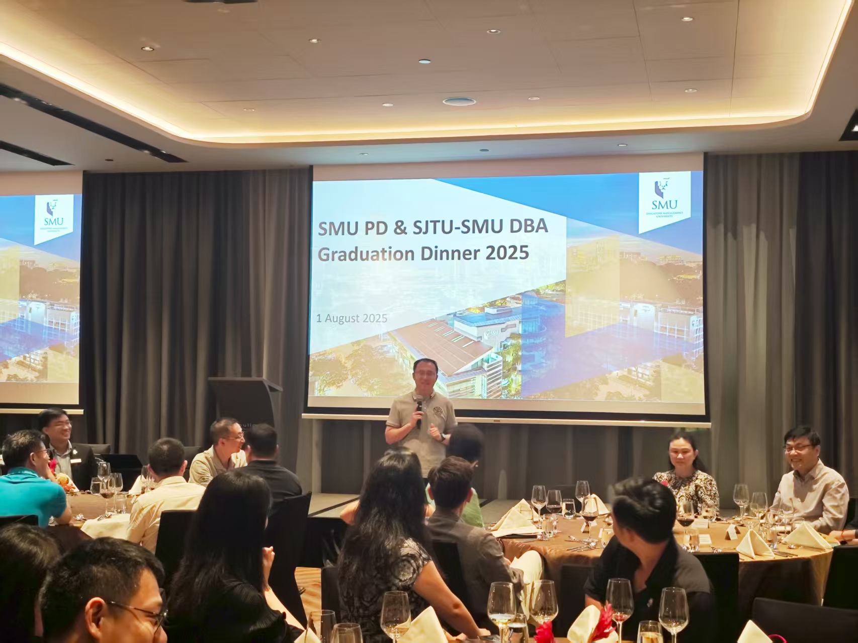 一场温馨的毕业晚宴在新加坡铂尔曼酒店举行。商学院的领导、学术主任、论文导师代表等出席典礼,交大安泰副院长桑大伟在致辞中表示,学术性的思考和反思能够帮助学员们更深刻地去理解企业、理解变革、理解行业。他鼓励大家去做更好、更有影响力的研究,来促进企业,乃至社会的发展。项目授课教授、博士生导师蒋炜宣读了2025 SJTU-SMU DBA毕业同学名单,回顾大家过往学习研究的学术之路,为大家送上毕业祝福。SPG Sports International总经理、2020级学员王向东作为毕业生代表发言,他动情回顾了学习历程中的点滴收获,从黄浦江畔到狮城海岸,这段双城求学经历让大家收获了跨文化的视野,科学的研究方法,更结识了终生的良师益友。