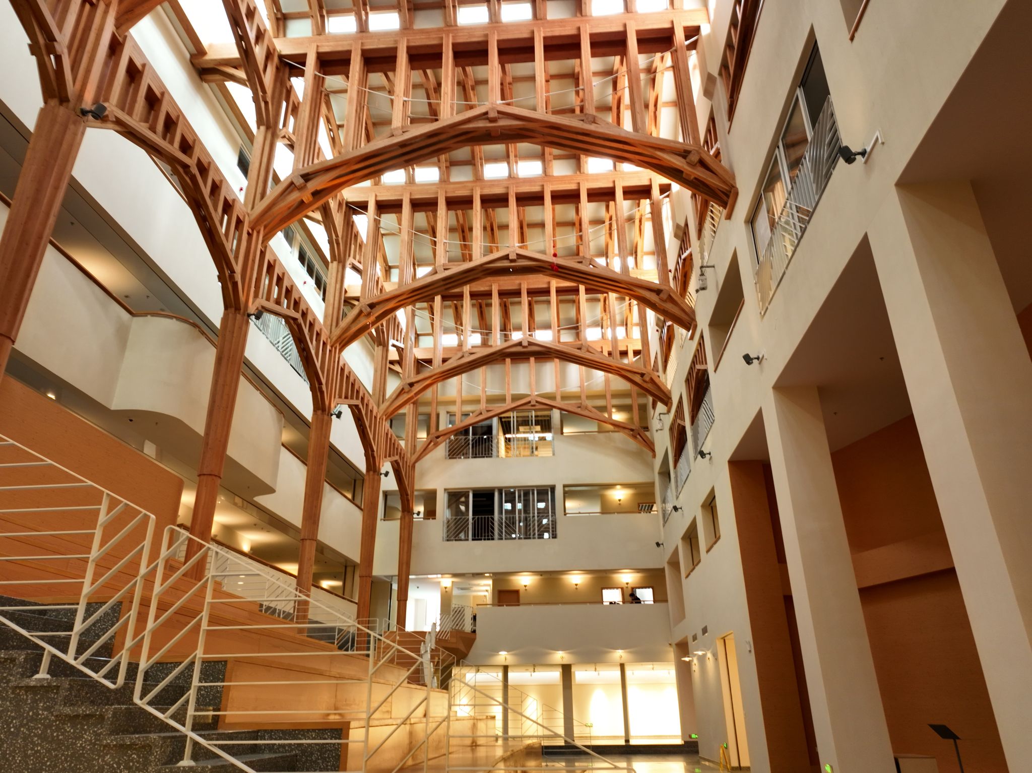 闵行校区设计大楼改扩建项目竣工,项目总建筑面积达到13300多平方米,本次改扩建增加建筑面积约2100平方米,工程2023年3月竣工。大楼外立面采用陶板并增加肌理效果,中庭使用木结构,内部功能涵盖教室、工艺作坊、办公室等,成为设计学科发展的主阵地、科学艺术融合的新平台、师生交流共享的“会客厅”,打造了校园新的“网红”建筑。