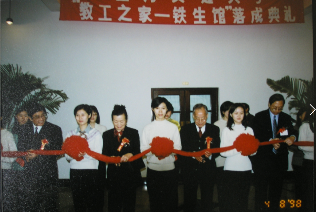 铁生馆缘起于1996年。彼时,1938届校友秦本鉴、孙琇莹夫妇怀着饮水思源之情,捐资50万美元建造了铁生馆作为教职工活动场所。“铁生馆”命名是为纪念孙琇莹女士之父、交通大学土木学院前院长孙谋(字铁生)。图为原副校长范祖德与秦本鉴、孙琇莹夫妇↓