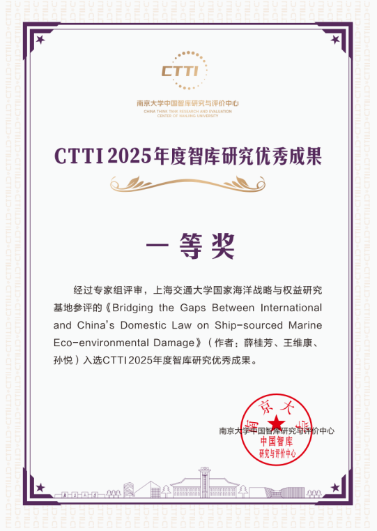 近日,南京大学中国智库研究与评价中心、光明日报智库研究与发布中心共同举办2025新型智库治理论坛,发布2025年度中国智库索引(CTTI)智库百强榜、智库建设最佳案例、智库研究优秀成果推介名单。上海高校智库——欧宝app官方网站下载国家海洋战略与权益研究基地获评CTTI 2025年度来源高校智库百强榜A+智库,为欧宝app官方网站下载唯一获评A+等级的智库以及全国唯一获评A+等级的海洋类高校智库。同时,智库参评的建设案例《打造海洋新疆域特色智慧高地 助推涉外海洋法治建设》获智库建设示范案例,智库参评的智库成果《Bridging the Gaps Between International and China’s Domestic Law on Ship-sourced Marine Eco-environmental Damage》(作者:薛桂芳、王维康、孙悦)获智库优秀成果一等奖。