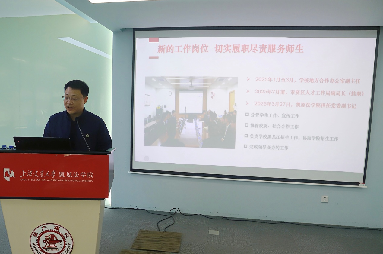 解志韬以《党建引领促发展 实干担当谱新章》为题,代表学院党委作2025年度工作报告并进行个人述职。他从理论武装、中央八项规定学习教育、队伍建设、铸魂育人、发展保障、凝心聚力等方面进行了系统汇报。解志韬表示,学院党委将始终以习近平法治思想精神作为法学研究和教育的根本遵循和行动指引,持续增强把方向、谋大局、定政策、促改革的政治定力和履职能力,为学院高质量发展筑牢坚实政治基础、思想基础和组织基础,为推动习近平法治思想学习贯彻走深走实、强化法学研究与人才培养在全面依法治国中的支撑作用,贡献交大法学的智慧与力量。