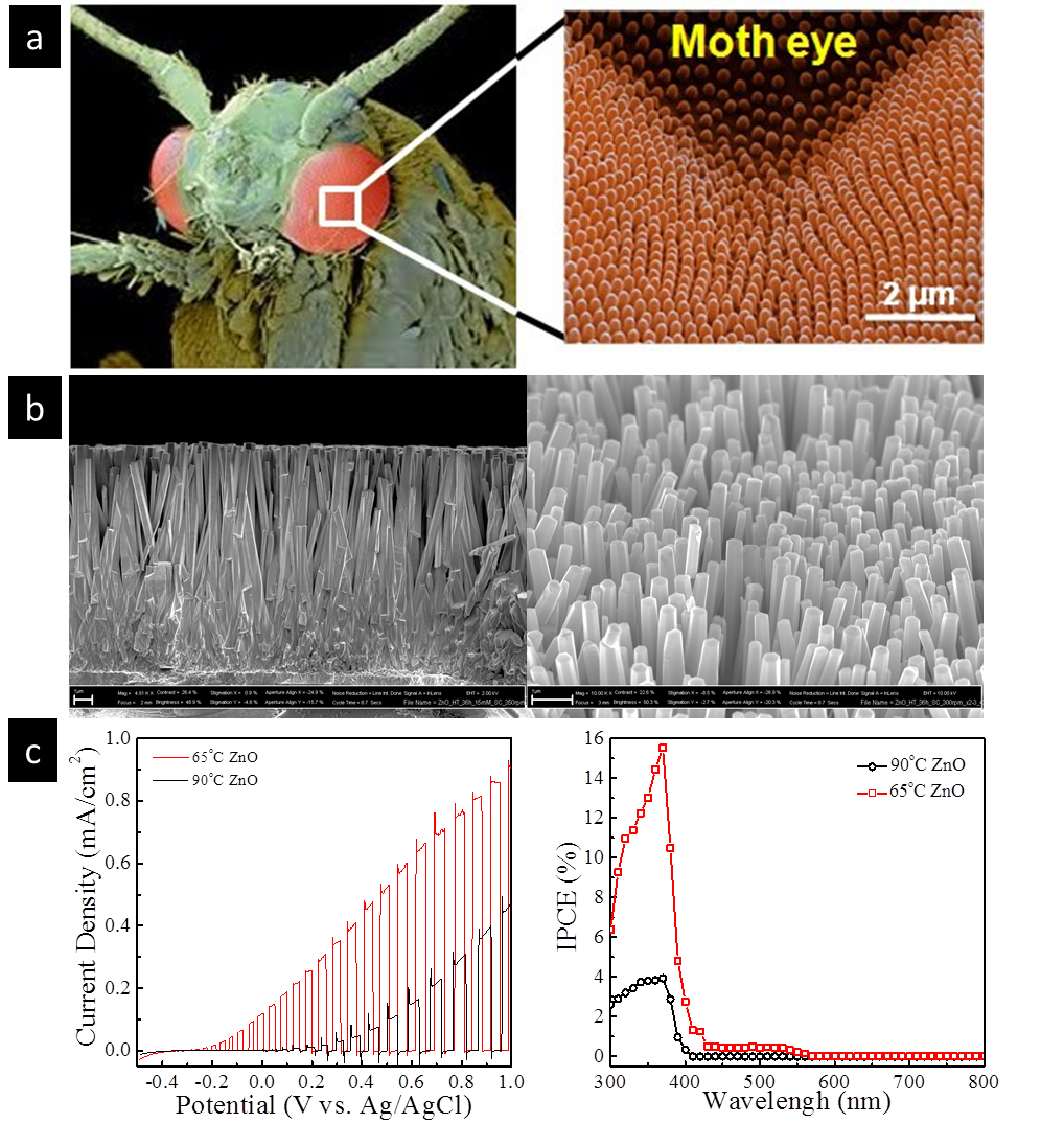 图1 (a)基于仿生蛾眼减反射结构(来源︰“Edgehog Offering Robust Anti-Reflection Technology usingNanostructures”,Display Daily)的(b)氧化锌纳米棒光电极(c)用于太阳光电化学水解制氢。