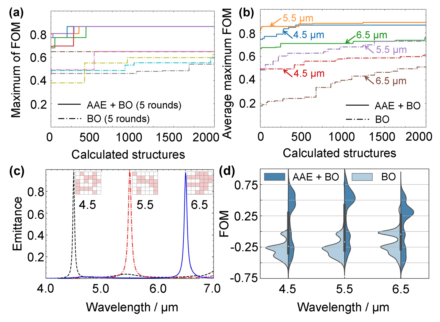 为展示提出混合设计框架的性能,共选取三个不同的目标发射波段并分别进行设计。在相同参数设置下分别进行5轮随机AAE+BO和5轮随机BO的统计结果表明,AAE+BO框架设计出的平均最大优值系数比BO框架设计出的结果至少高出0.1。最后,此项工作通过对比优化搜索过程中的搜索情况,发现不同优化框架搜索到的优值系数范围有明显偏差,进一步证实了只需几百组数据作为训练集的混合设计框架可以快速实现高维候选空间的目标特性设计,极大节省了全局搜索的设计成本,同时也扩展了BO在高维设计问题中的应用。该方法也可推广至光学、热导和热电等领域的高自由度优化设计问题。