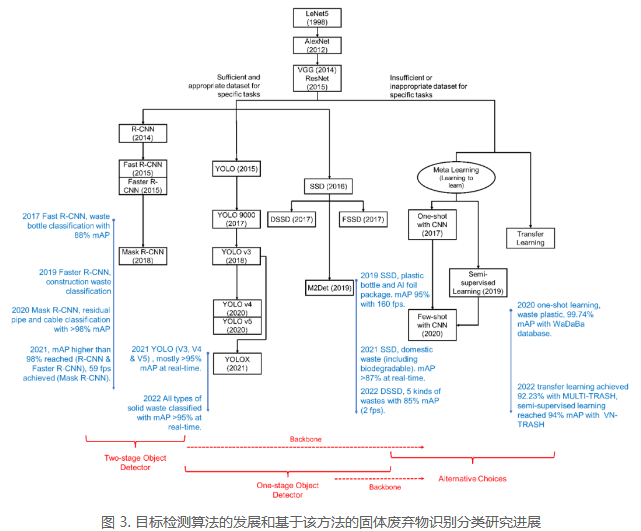 R-CNN目标检测在推出后不久就被运用在自动化固体废物检测分类中,在生活垃圾,建材垃圾,电子废弃物等固体废弃物的检测与分类实践中都取得了优秀的结果。因为实际应用需要很高的检测速度和精度,Faster R-CNN和Mask R-CNN成为该系列中被推荐使用的目标检测器,其中使用ResNet或MobileNet为卷积骨干的Mask R-CNN的检测速度能够达到 >40fps。此外,Faster R-CNN 和Mask R-CNN 在检测小物体方面具有良好的性能。