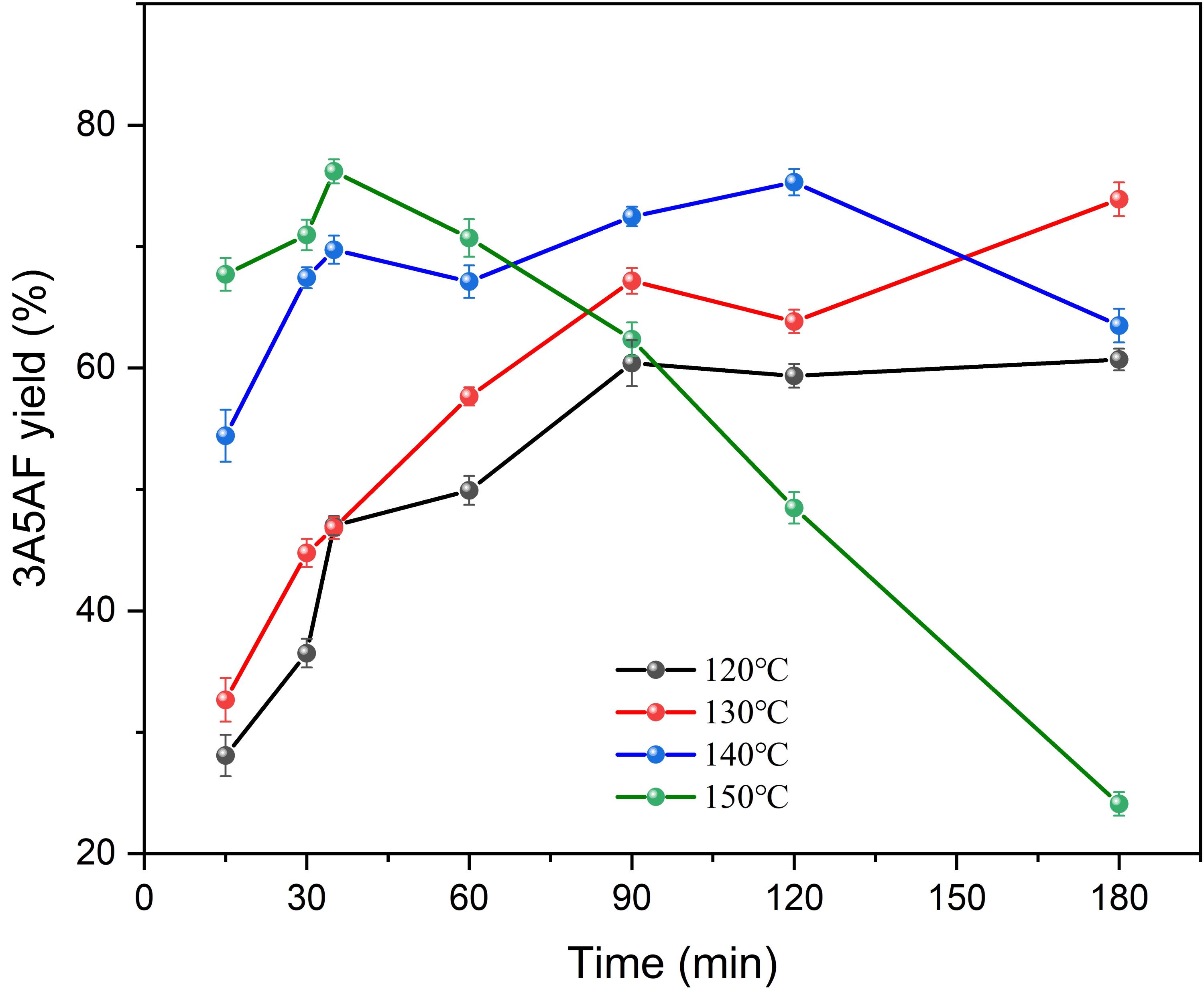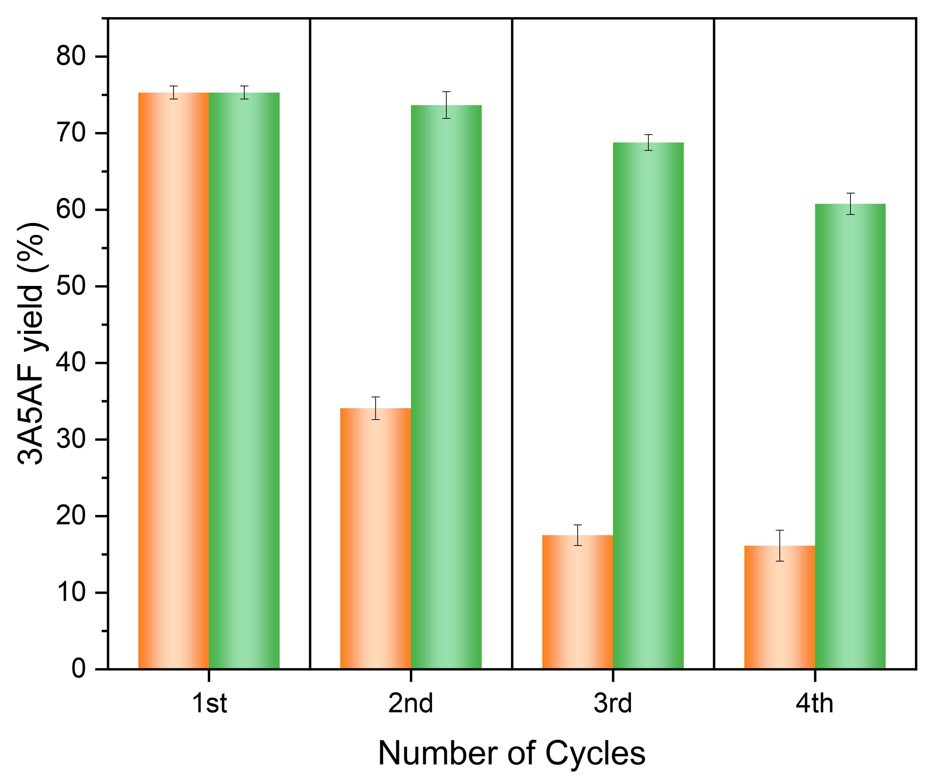 此外团队还研究了反应的溶剂效应。尽管先前研究中常用的DMF、DMA、DMSO能够更好地溶解NAG,但其脱水性能在相对低温条件明显劣于GVL。总的来说,团队设计的反应体系可以在相对温和的温度范围(120-150℃)内获得>70%产率的3A5AF(产率均高于先前所报道的反应体系),催化剂在第四次循环后可以保持约60%的产品收率(活性炭吸附胡敏素使得循环性能增强,见图3绿色柱状图),这将有利于大规模的实际应用。