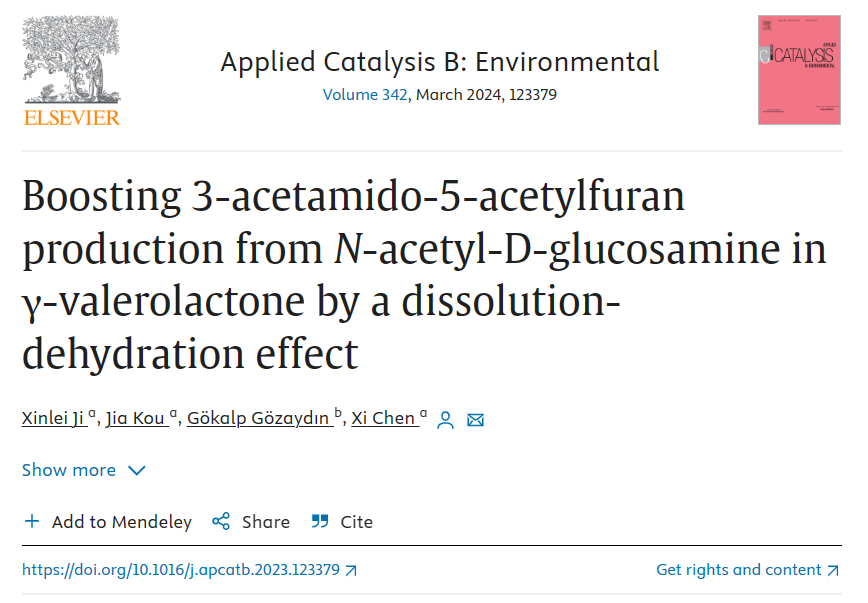 近日,我院陈熙副教授团队在环境催化领域著名学术期刊《Applied Catalysis B: Environmental》(IF=22.1)上发表了题为“Boosting 3-acetamido-5-acetylfuran production from N-acetyl-D-glucosamine in γ-valerolactone by a dissolution-dehydration effect”的研究论文。该文章首次实现了在生物基绿色溶剂中以海洋废弃物甲壳素为原料生产有机含氮分子3A5AF,为甲壳素生物炼制工业的绿色、可持续生产提供了新可能性。