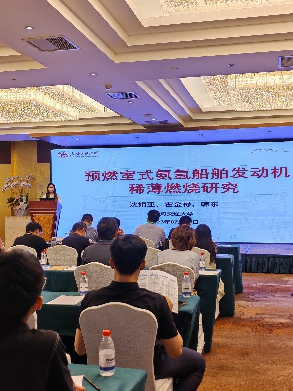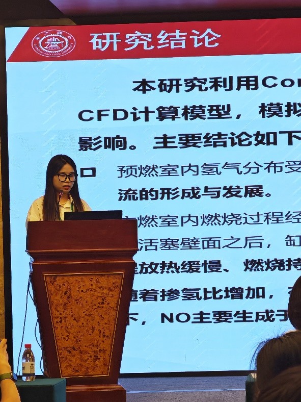 2023年7月17日-20日,2023年内燃动力碳中和与排放控制学术年会在江苏无锡举行。我院2021级硕士研究生沈娟亚参会并作题为“预燃室式氨氢船舶发动机稀薄燃烧研究”的报告。报告研究的预燃室多点分布式湍流射流点火系统,点火能量高,而且可以提高混合气的燃烧稳定性,有着扩展氨气稀薄燃烧极限。该研究采用数值模拟的方法开展了预燃室射流点火引燃稀薄氨氢混合气的研究。利用Converge软件建立了预燃室射流点火氨氢燃料发动机的三维CFD计算模型,模拟了其燃烧过程,分析了掺氢比对船舶发动机燃烧与排放的影响。