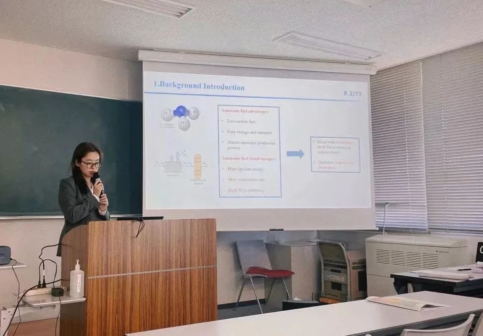 马翼同学作题为“Performance study of an innovative ammonia-fueled SOFC cogeneration power system for zero carbon emission ships”的汇报,针对目前船舶发电系统效率较低、空间占用大、存在安全隐患等问题,提出了一种高效紧凑的氨燃料船舶SOFC发电系统,设计了一种催化燃烧一体式氨分解器。报告研究了阳极尾气再循环比、分解一体器气体方向、燃料利用率以及氨氧比对于系统的耦合效应,并根据系统敏感性提出了不同场景下的调控方式。他的研究可为绿色低碳船舶的发展提供借鉴。