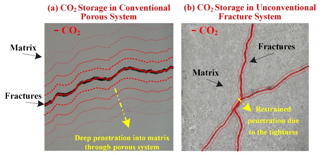 图2(a)常规(裂缝和基质)和(b)非常规(裂缝) 储层中不同CO2储存和渗流机理