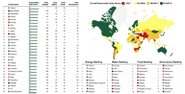 图1表示全球生物航油可持续性指数,每个国家和地区的可持续性指数得分是根据能源、水、食物和治理单独领域的排名汇总而成。芬兰在给定情境下以57.4的可持续性指数得分成为排名第一的国家。在排名前十的大多数其他国家都在2-3个可持续发展领域处于最佳四分之一,没有一个国家或地区在所有四个领域都表现出色,这说明难以平衡将有限的能量-水-食物资源用于新可持续航空的目标。此外,地区分布图上的颜色直观的反应各个洲之间可持续发展水平,其中欧洲由于粮食供应稳定和政府运作良好占据主导地位。对于个别领域,能源排名有利于土地面积较大的国家;水资源和经济活动密切相关;食品安全得分较高的通常是富裕国家,可以监管良好的商场;治理排名与世界银行划分的高收入国家具有紧密联系。