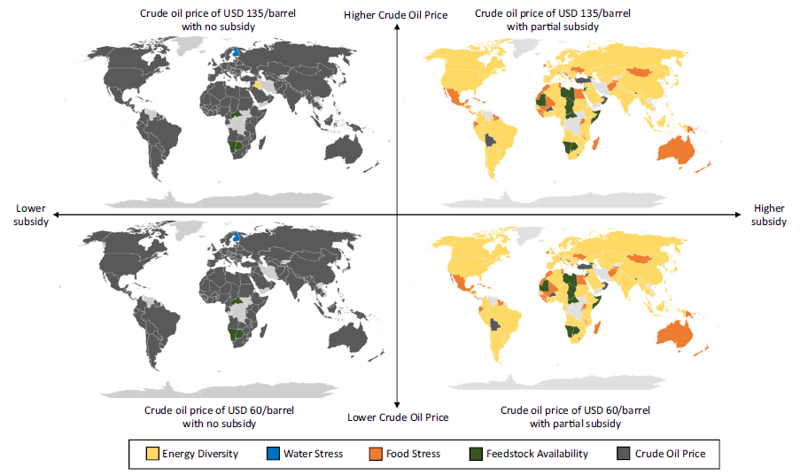 图5分析潜在盈利的可再生生物航油生产的限制因素,寻找航空燃料工业的资源关系需求和经济之间的微妙平衡。其中五个限制因素主要是能源多样性、水压力、食品压力、原料可用性和原油价格。限制因素对于原油价格并没有表现出敏感性,相反,它们几乎完全受到政府补贴的影响。然而,即使提供“部分补贴”,随着盈利条件改善,主要是能量-水-食物关系类型的限制因素也会浮出水面。这可能会导致RJF成为其自身成功的牺牲品,即大量RJF将进入80个国家和地区的航空部门,从而引发对燃料来源缺乏多样性的担忧。在所有的情况下,水压力都不太可能成为限制因素。