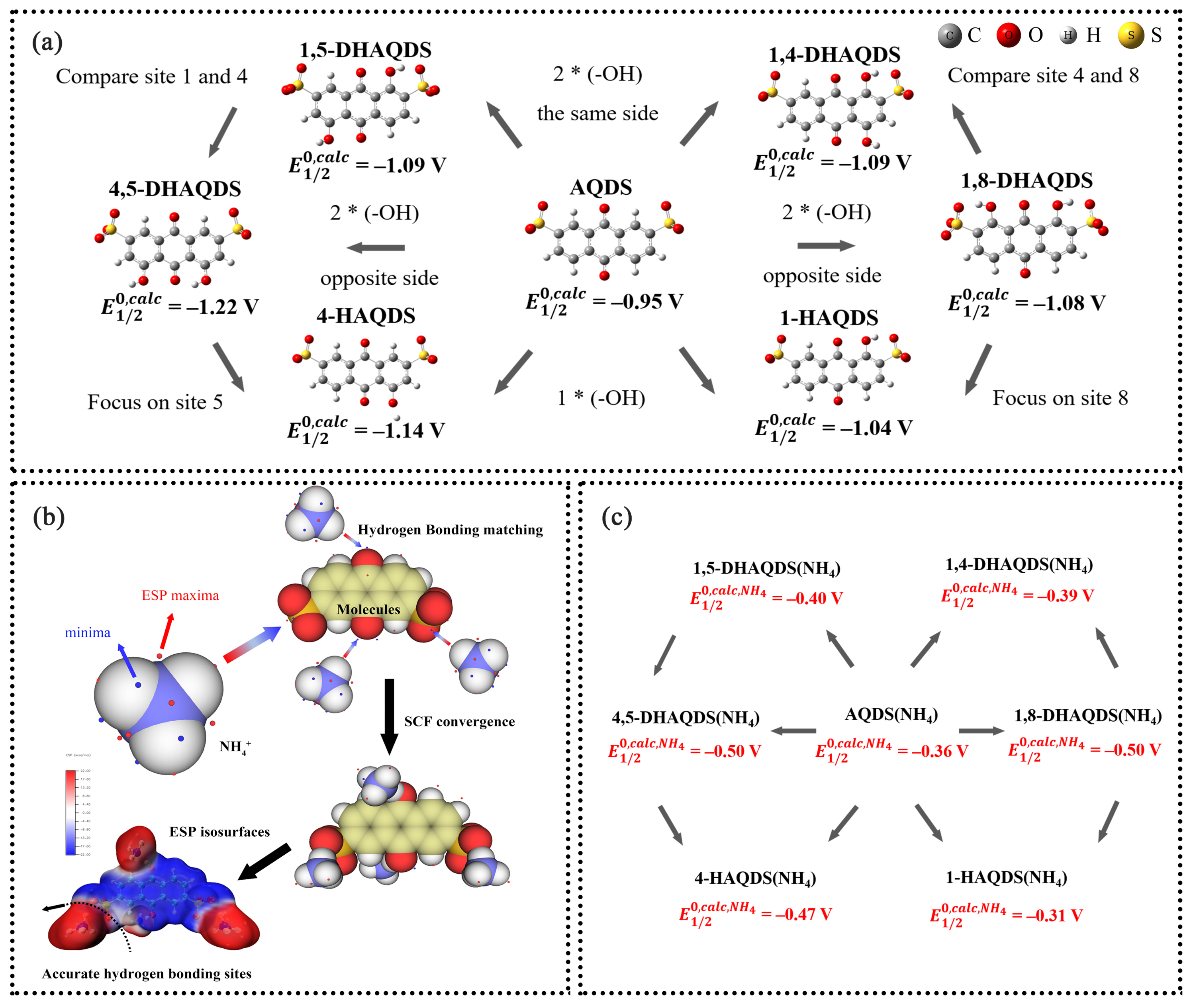 图2. 通过 DFT 计算的不含/含 NH4+的 AQDS 衍生物的 RPs:(a)不含NH4+的 AQDS 衍生物;(b)使用 ESP 计算氢键位点的过程;(c)含NH4+的 AQDS 衍生物。