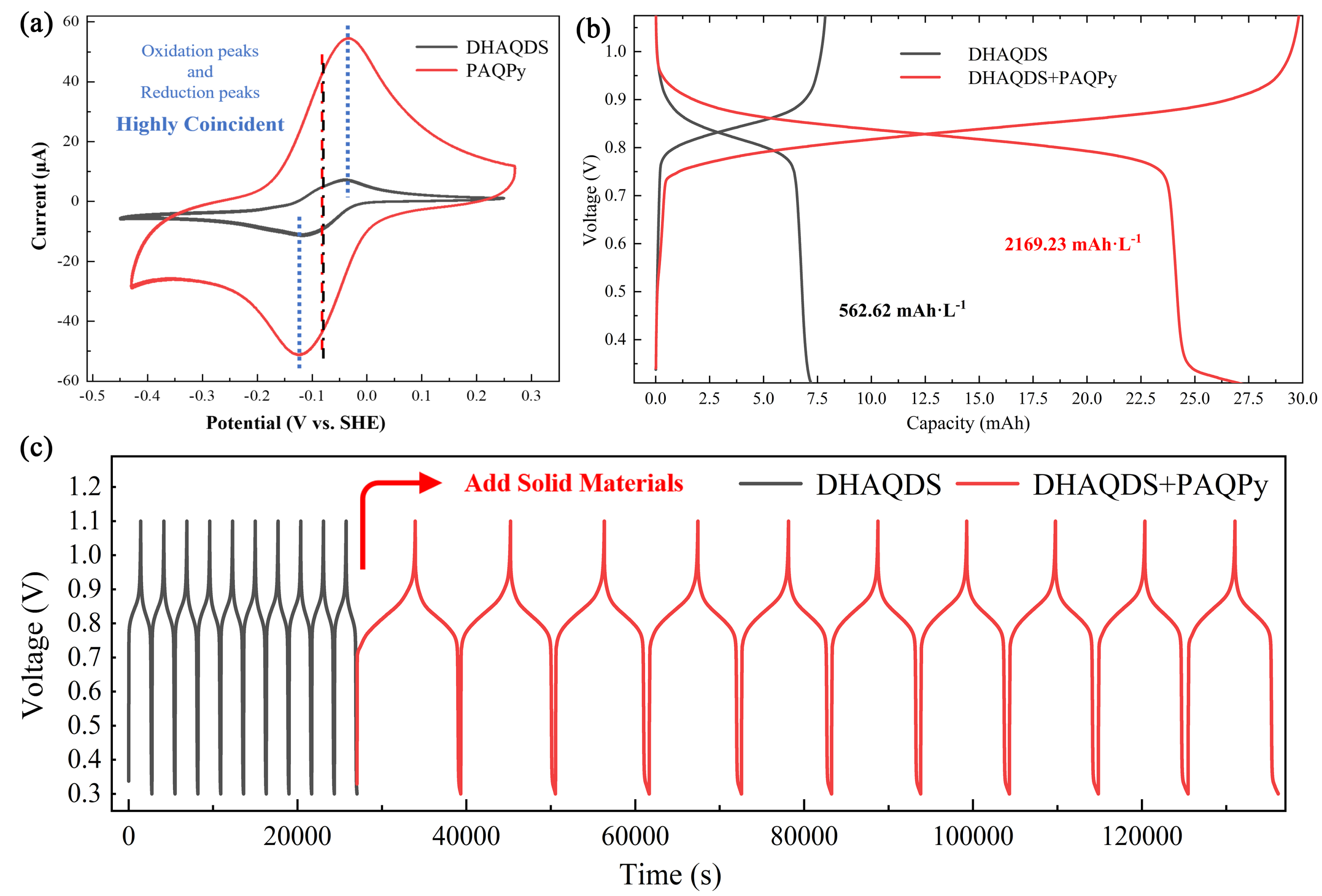 图 5. (a)12.86 mM 1,8-DHAQDS 和 PAQPy在 2.5 M H2SO4中的 CV;在 13 mL 12.86 mM 1,8-DHAQDS 溶液槽中加入 0.3 g 固体前后 RT-AORFB 的电压曲线:(b)容量-电压曲线和(c)时间-电压曲线。