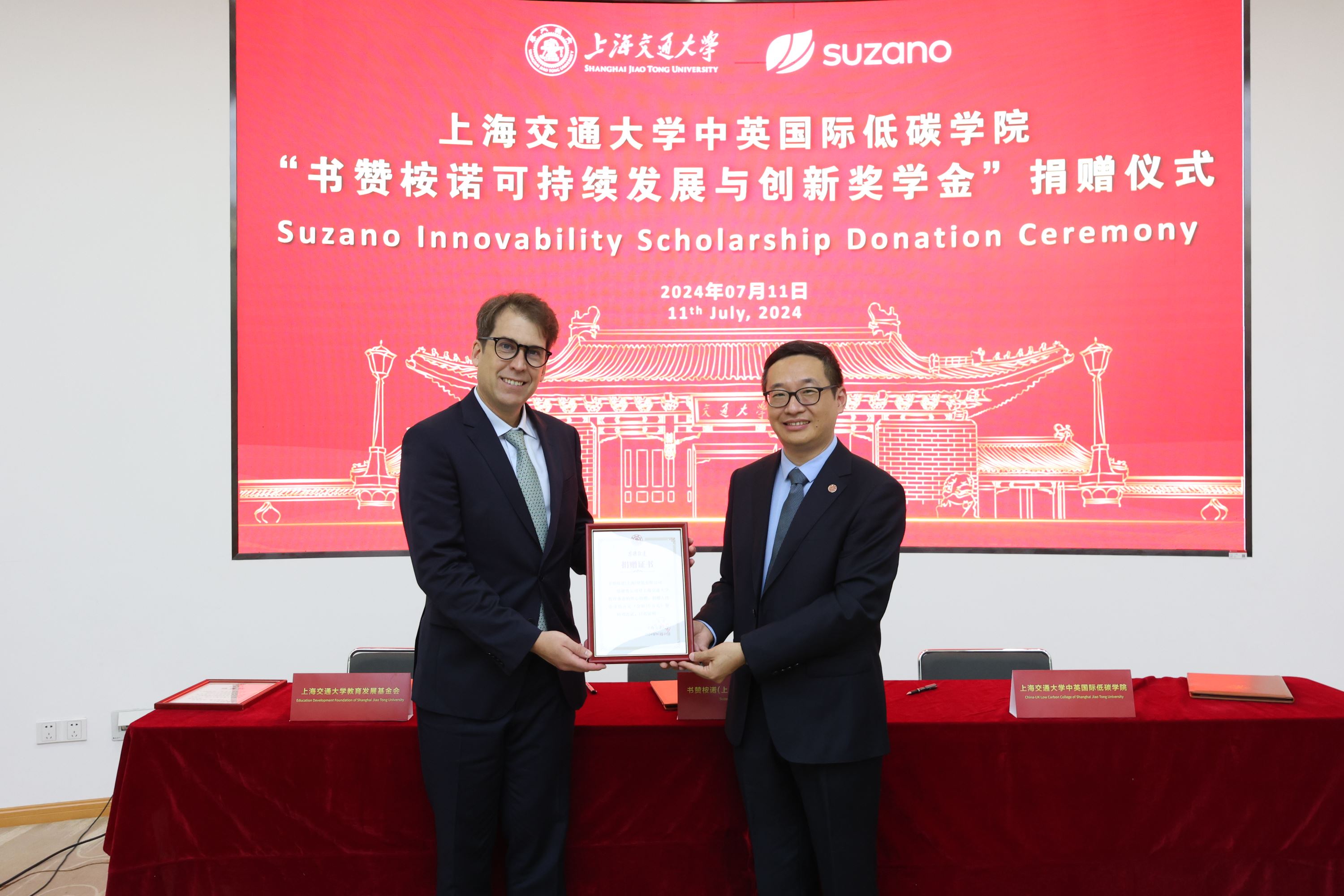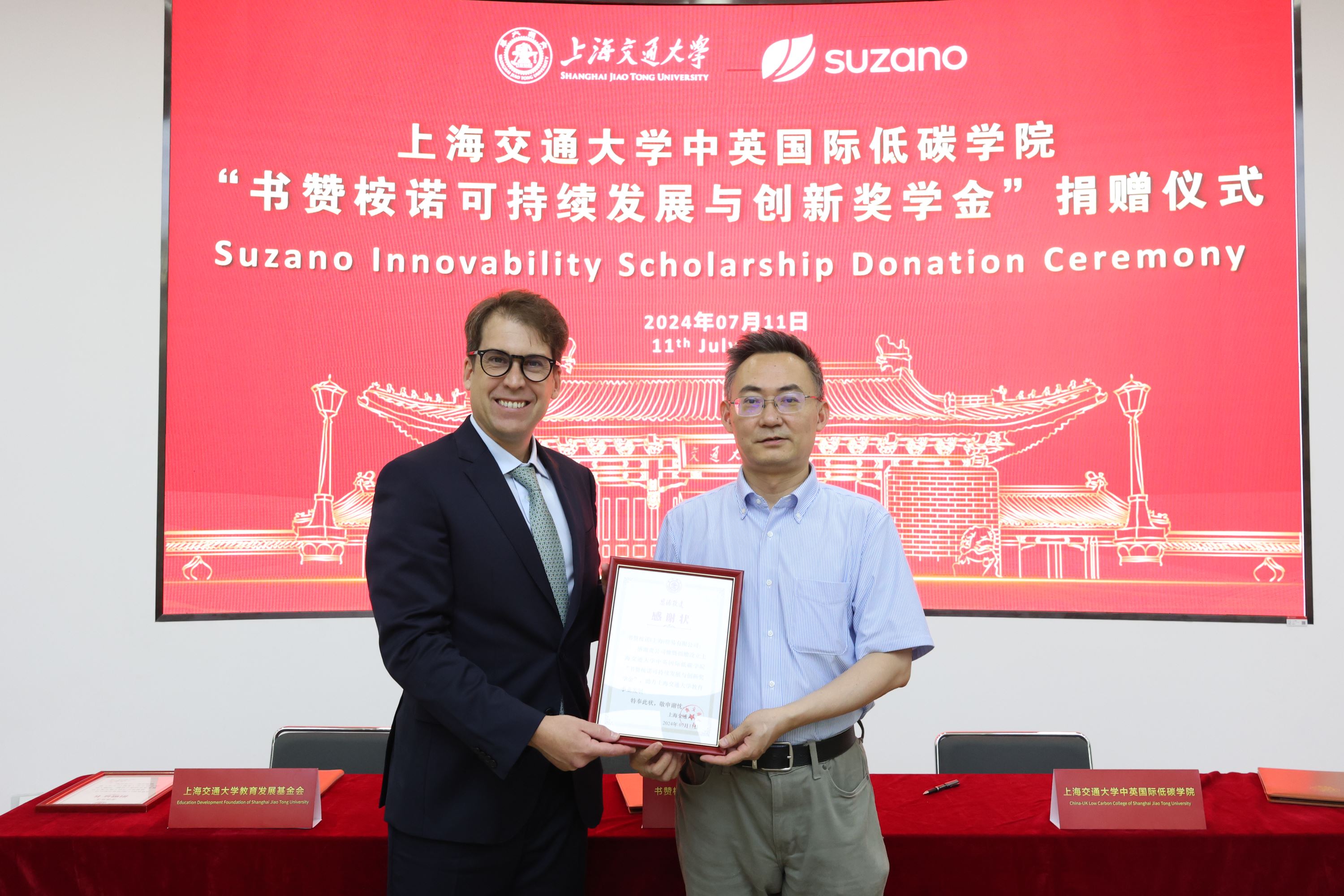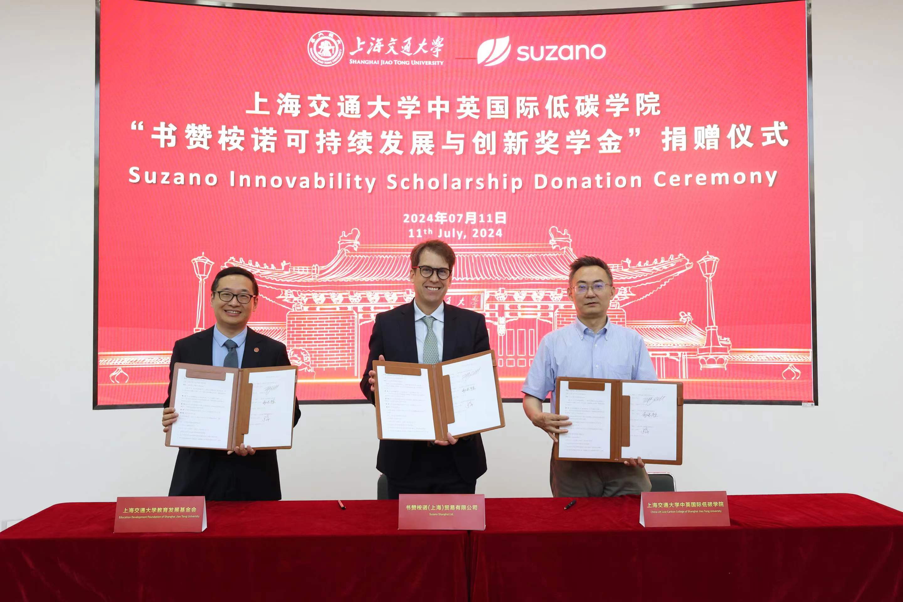 7月11日,全球大型商品浆生产商书赞桉诺今天宣布在欧宝app官方网站下载中英国际低碳学院设立“书赞桉诺可持续发展与创新奖学金”,奖学金捐赠仪式在欧宝app官方网站下载闵行校区举行。书赞桉诺亚洲区业务管理总裁马欣荣、可持续发展负责人苏宇婕到校出席仪式。欧宝app官方网站下载教育发展基金会副秘书长于洋,中英国际低碳学院院长赵长颖及教师代表和学生代表参加仪式。