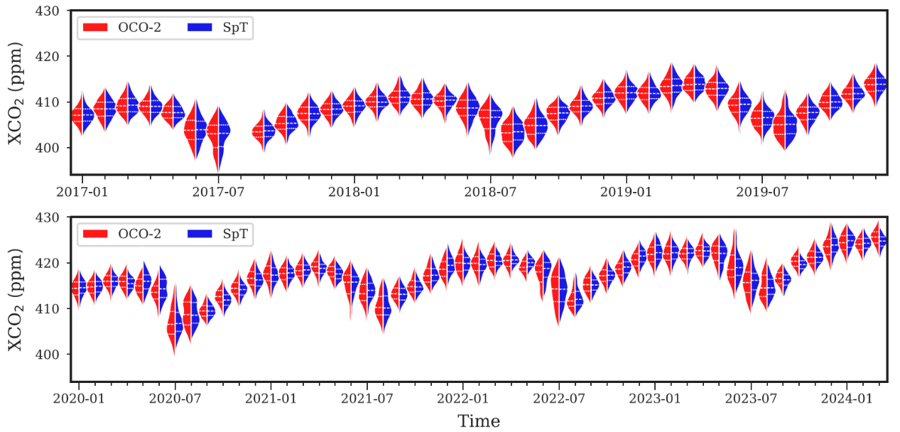 研究团队使用TCCON(全球碳柱总量观测网络)地基测量数据对SpT模型进行了严格验证,结果表明,该模型能够精准捕捉XCO2的季节性和区域性变化。此外,研究还展示了SpT模型在东亚地区的空间测试结果,并讨论了其全球范围内扩展应用的可行性。该模型也可用于未来多颗卫星数据的快速处理,为碳排放监测和碳交易市场提供高精度数据支撑。
