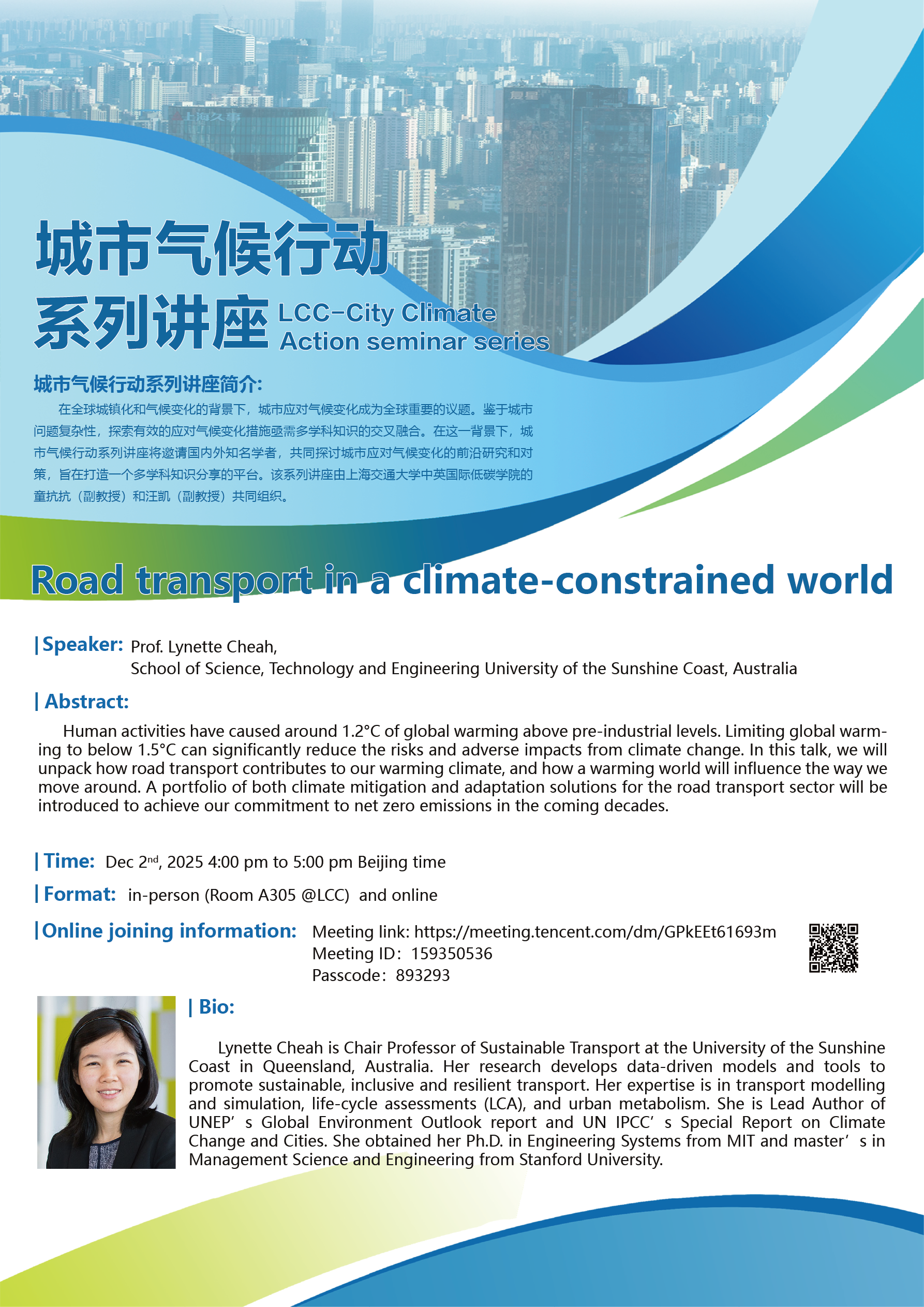levels. Limiting global warming to below 1.5°C can significantly reduce the risks and adverse impacts from climate change. In this talk, we will unpack how road transport contributes to our warming climate, and how a warming world will influence the way we move around. A portfolio of both climate mitigation and adaptation solutions for the road transport sector will be introduced to achieve our commitment to net zero emissions in the coming decades.