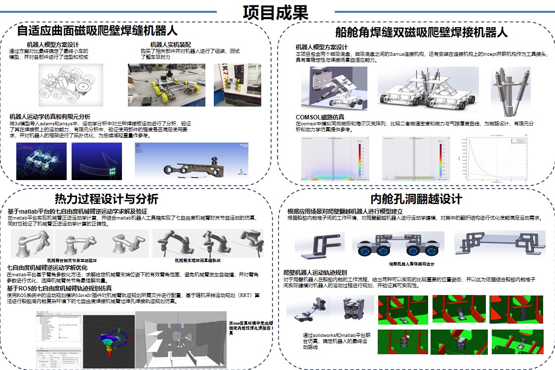 对于自适应曲面磁吸爬壁焊缝机器人,目前已完成机器人的模型方案设计,对其进行了运动学仿真和有限元分析,并进行了机器人的实机装配;对于船舱角焊缝双磁吸爬壁机器人,目前完成了机器人的模型方案设计以及COMSOL磁路仿真;对于过焊孔仿人机械臂焊接机器人,完成基于matlab平台的七自由度机械臂逆运动学求解及验证,对七自由度机械臂逆运动学解优化,并基于ROS的七自由度机械臂轨迹规划仿真;对于内舱翻越穿孔机器人,目前完成了机器人的整体模型建立,并通过运动仿真对机器人翻越底舱障碍的运动进行了路径规划。