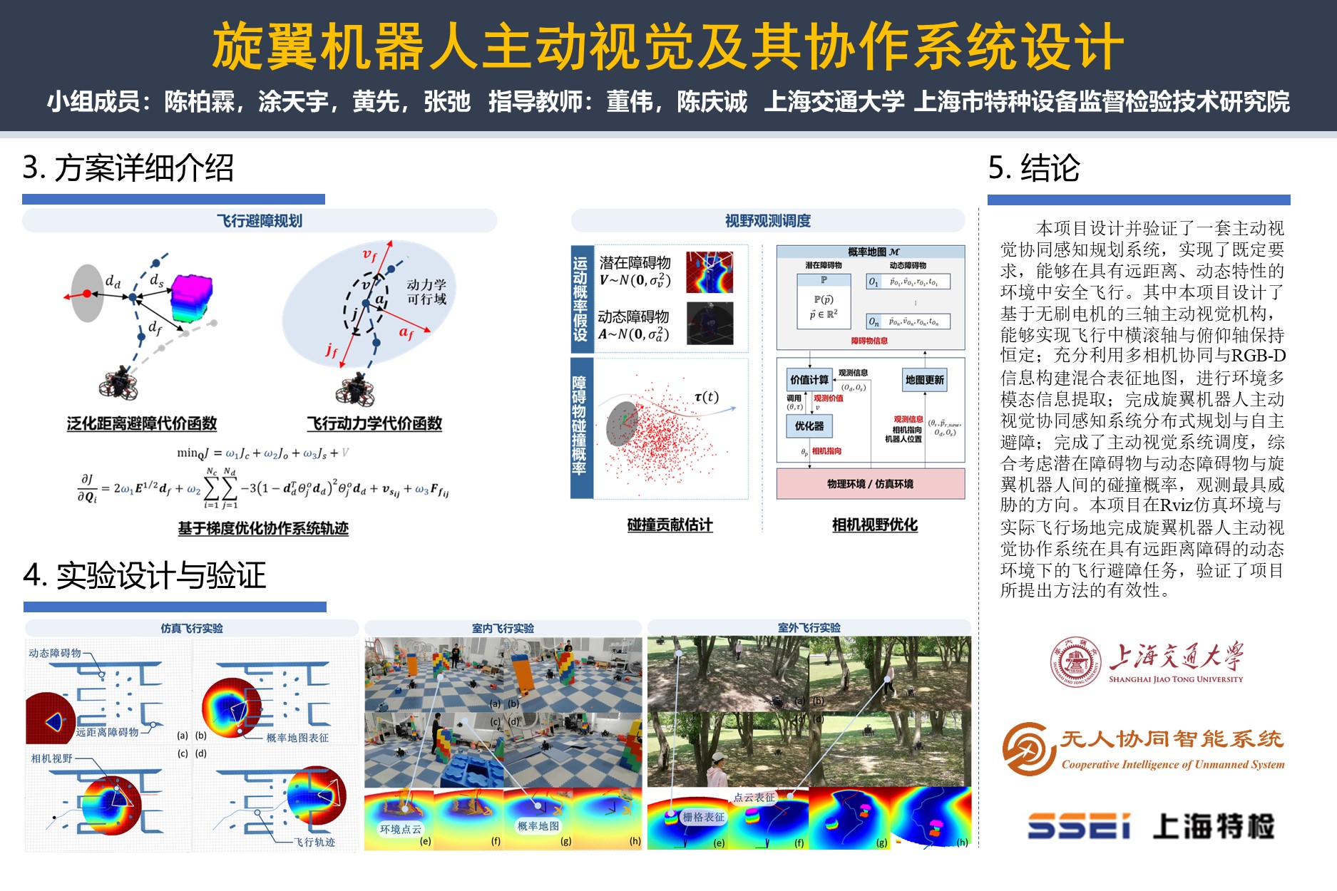 针对上述诉求,本项目设计多机协同主动视觉协同观测方法估计远距离障碍物并计算任务前瞻轨迹,并构建多目标泛化距离模型优化旋翼机器人的轨迹,降低旋翼机器人执行远距离任务的飞行时间;设计主动视觉机构控制相机旋转,利用拓扑优化与模态分析提升机构的轻便性与稳定性,利用点云与像素系语义信息构建动态障碍物包络,融合静态栅格地图与旋翼机器人协同感知语义地图对环境进行多模态表征,并设计调度算法规划主动视觉系统持续观测动态障碍物与潜在障碍物,基于多模态表征构建价值函数优化调度主动视觉机构,以提升旋翼机器人飞行穿越动态障碍物的安全性。