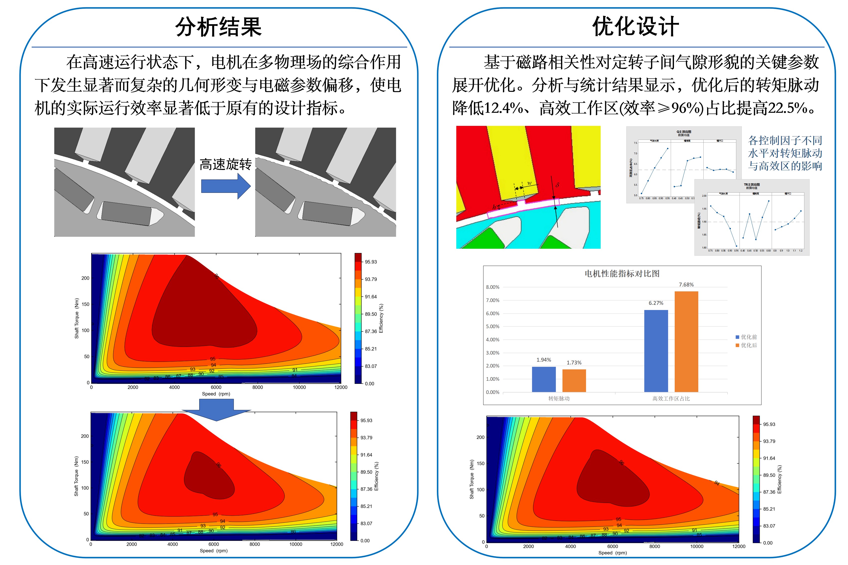 在“双碳”战略驱动下,我国新能源汽车取得蓬勃发展。电机作为新能源汽车动力系统的核心部件,在很大程度上决定着车辆动力性、运载安全性和能源利用率。本项目通过研究车用高速永磁同步主驱电机内部“电-磁-流-热-力”等多物理场的耦合机理,建立多物理场耦合分析联合仿真模型,分析电机运行时关键特性的变化规律,开展电机优化设计,抑制扭矩脉动、提升电机常态工作区的综合效率。