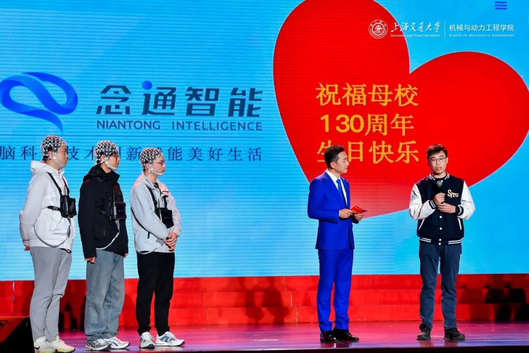 机动校友企业--念通智能脑机接口团队也来到了音乐会现场,随机选出现场的5位校友佩戴脑机接口设备,闭上眼睛倾听音乐,并在大屏幕上实时显示参与者的脑电波变化。通过脑机接口和音乐疗愈的结合,展现了脑机接口未来在医疗领域的创新诊疗方案。4位企业校友,共同在舞台上预祝母校130周岁生日快乐!