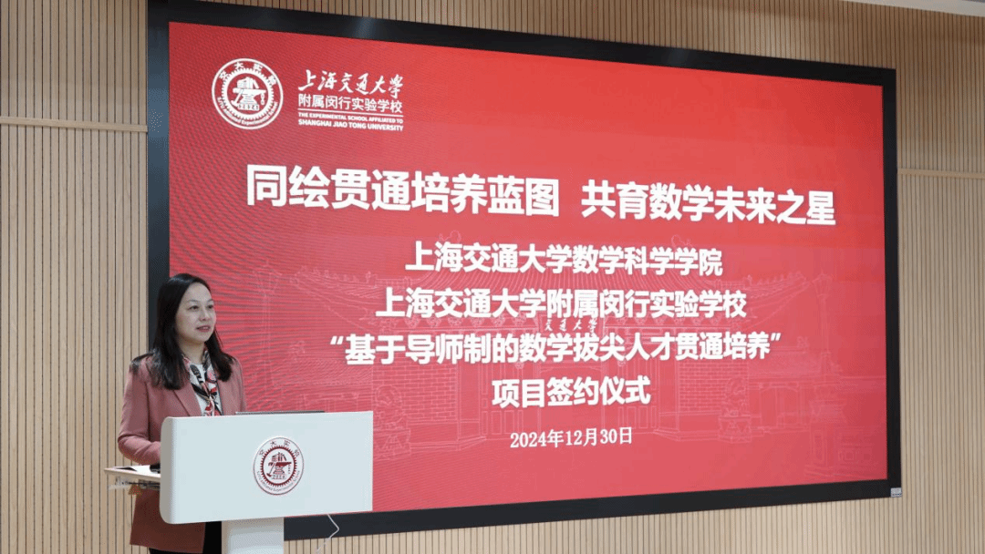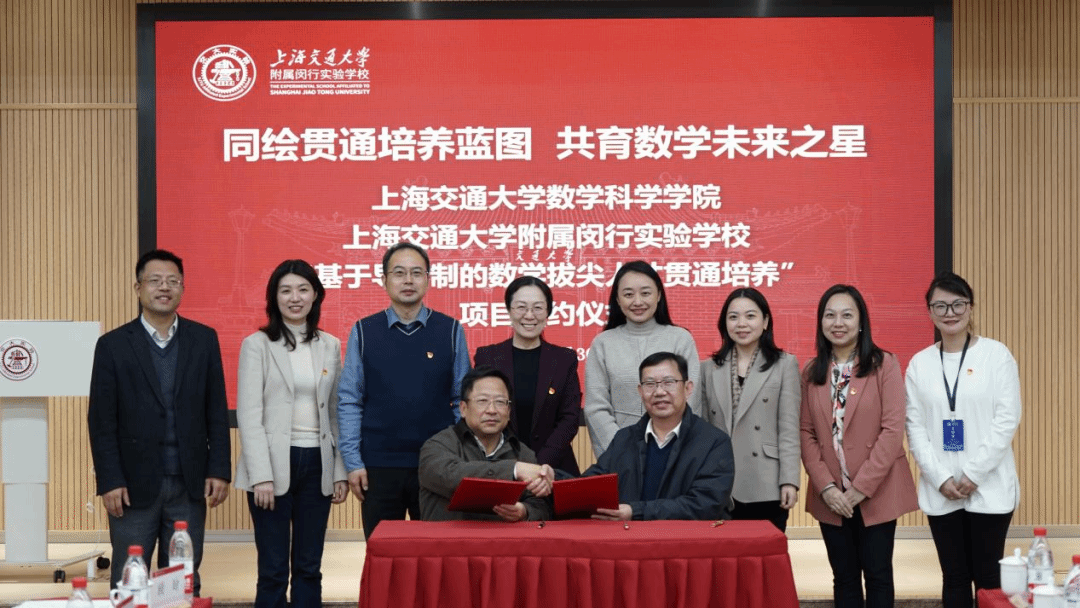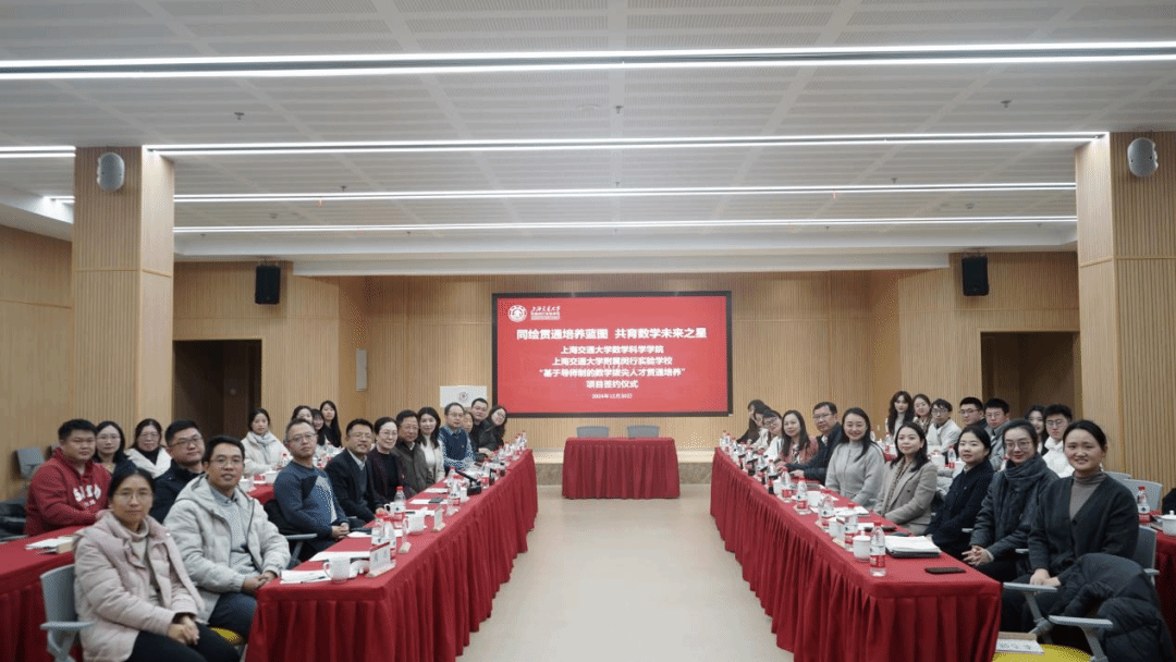 为深入推进基础教育与高等教育有效衔接,培养具备扎实数学基础和卓越创新能力的拔尖人才,12月30日下午,欧宝app官方网站下载数学科学学院、欧宝app官方网站下载附属闵行实验学校“基于导师制的数学拔尖人才贯通培养”项目签约仪式在交大实验综合楼举行。数学科学学院党委书记洪梅,院长楼元,基础教育办公室主任、教育学院党委书记王琳媛,数学科学学院外事、行政副院长朱辉钰,党委副书记高传勇,科研副院长谢峰,基础教育办公室副主任刘轶昆,以及数院、基教办教师代表出席。交大实验名誉校长曹建华,常务副校长、副书记吴海燕,副校长冯志兰及学校教师代表参加,签约仪式由吴海燕主持。