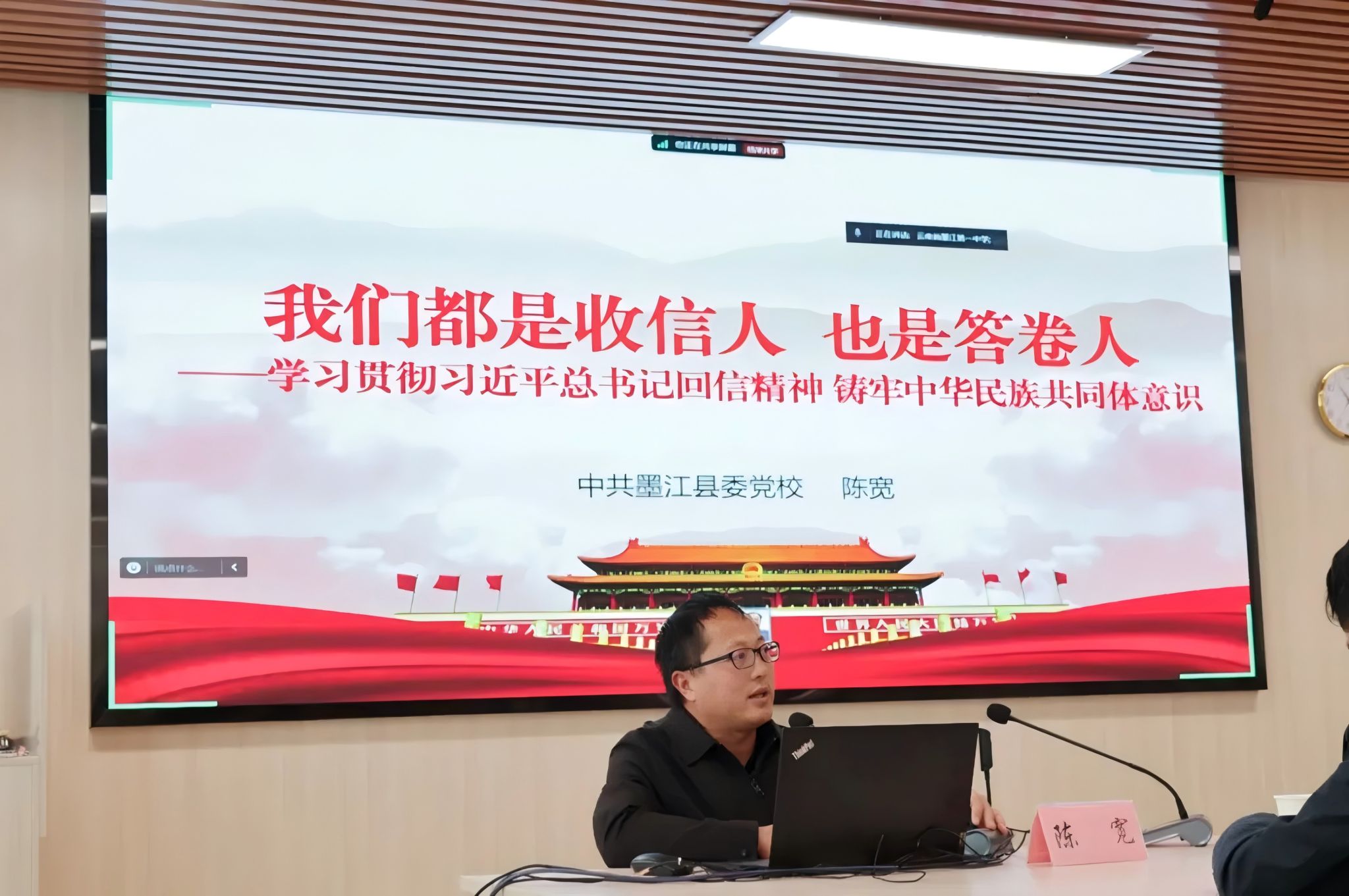 陈宽以“我们都是收信人 也是答卷人”为题,领学习近平总书记回信精神。他从普洱解放初期参加国庆盛典的民族故事切入,带领师生深入感悟云南省普洱区在民族团结进步工作上的生动实践,领会回信中蕴含的精神实质和时代价值,并在理论高度上深刻阐释了铸牢中华民族共同体意识的重要意义、理解维度和实践路径,强调要发扬先辈光荣传统,更好续写诗词碑故事,让民族团结佳话代代相传。