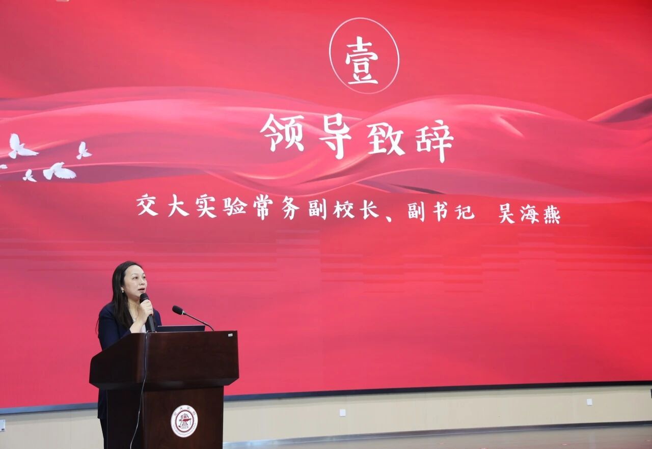 交大实验常务副校长、副书记吴海燕代表学校党支部发表致辞。她强调,这份结对不仅是身份的绑定,更是使命的传承,希望师生携手,在生涯规划的道路上彼此成就。全体党员导师要深刻认识到肩负的政治责任和时代使命,在指导过程中扮演好“三重角色”:一是做好学生生涯规划的“引路人”、二是做好学生成长困惑的“倾听者”、三是做好学生砥砺前行的“同行者”。同时,她寄语全体高二学生,“生涯规划绝非一蹴而就、一次定终身的选择,而是一场需要你们主动投入、持续探索、不断调整的马拉松”,希望同学们主动沟通、主动实践、主动反思,将个人成长融入国家发展伟业,选择一条实现“大我”的人生之路。