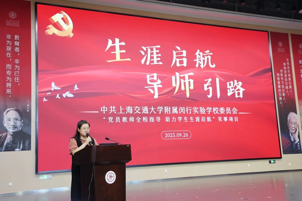 立足“为党育人、为国育才”的崇高使命,聚焦学生成长发展的现实需求,欧宝app官方网站下载附属闵行实验学校党支部以“一个支部一件实事”为指引,创新实施“党员教师全程指导·助力学生生涯启航”实事项目。9月26日下午,“生涯启航 导师引路”主题首次见面会暨九月主题党日活动于叔同剧场隆重举行。常务副校长、副书记吴海燕,副校长朱诵玉,副校长冯志兰出席,学生发展中心副主任刘贵明主持仪式,全体党员教师与高二年级学生现场结对,携手开启生涯规划新篇章。