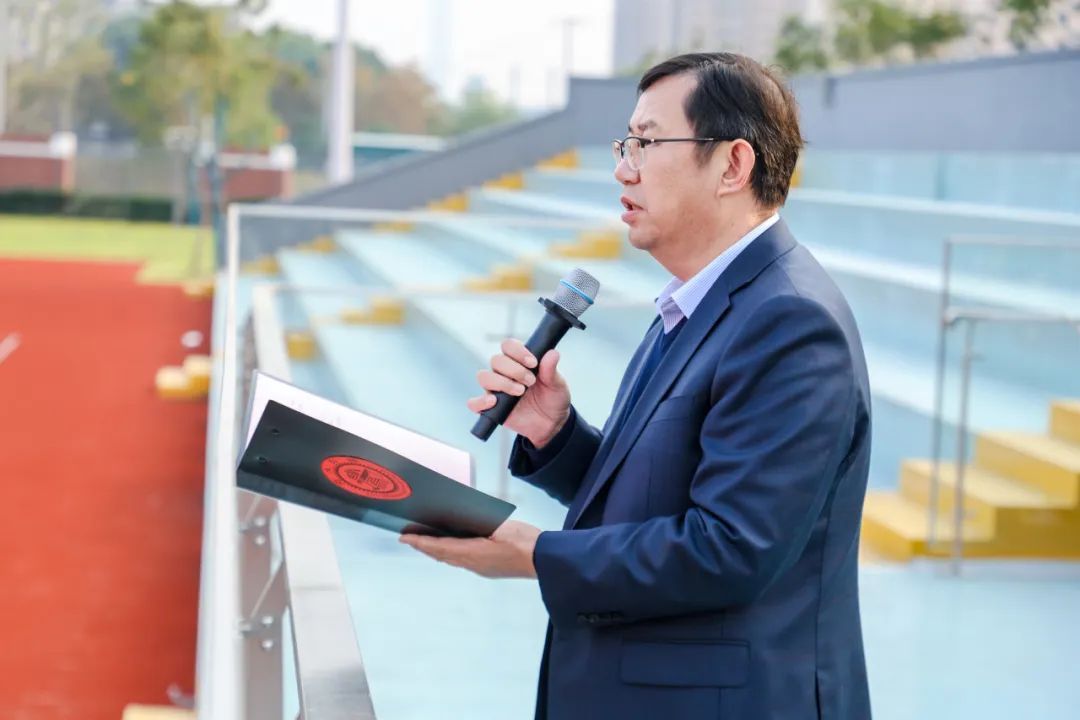 首先,交大实验名誉校长曹建华对本次趣味运动会给予了高度评价。他提到,运动会期间,赛场上处处洋溢着同学们的青春活力与拼搏精神。无论是紧张刺激的团体赛,还是充满挑战的个人竞技,大家都展现出了极高的热情和竞技水平,希望同学们能将这份在赛场上收获的坚韧、团结和乐观精神,延续到日常的学习与生活中,不断追求卓越,勇攀高峰。