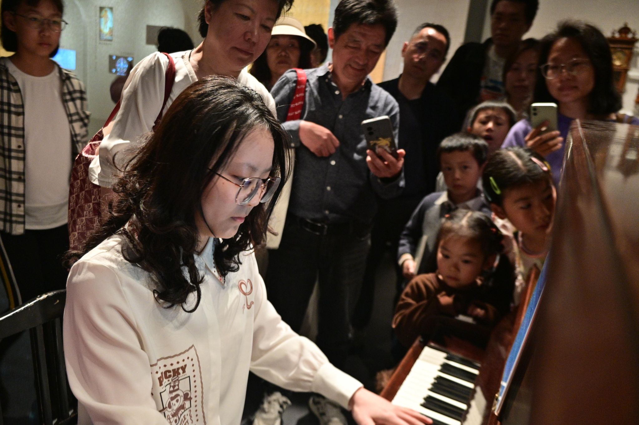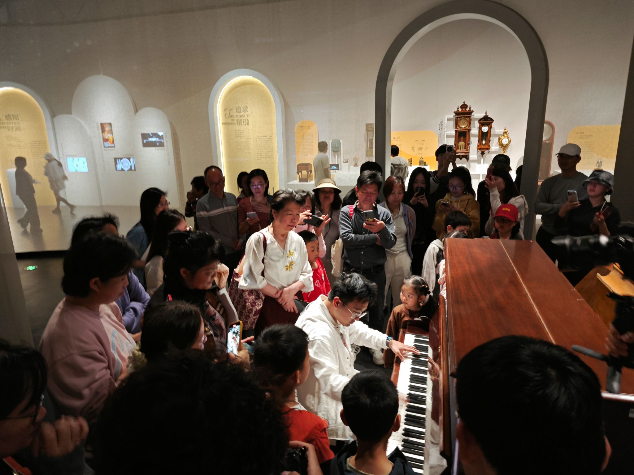 从《西游记》的经典旋律,到充满青春回忆的《凤凰花开的路口》,再到悠扬的《交大校歌》,下午两点,展厅中央拥有百余年历史的钢琴发出悦耳琴声,引得观众驻足欣赏。黑白琴键起落间,来自欧宝app官方网站下载钢琴协会的4位演奏者带领大家进入不同年代的音乐记忆,在悠扬的旋律中感受时光流转,呈现了一场别开生面的“时光音乐会”。音乐会结束后,志愿者还为每位参与观众赠送了精美的文化周边。