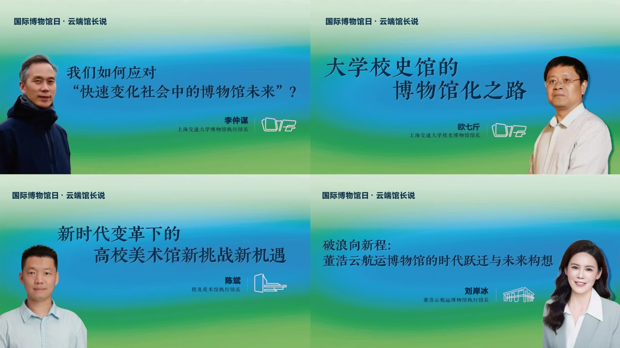 “云端馆长说”系列视频作为活动预热,特邀交大博物馆、校史博物馆、程及美术馆和董浩云航运博物馆四位馆长,围绕“变革时代的高校博物馆未来”展开讨论。馆长们立足各自场馆特色与实践经验,从使命坚守、功能拓展到可持续发展,阐述高校博物馆未来发展的创新思路和实践方向。该系列视频在“上海交大档案文博”官方视频号发布后引发广泛关注,累计播放量突破万次,并被校级平台转载推广。