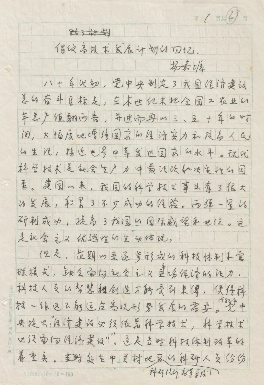 杨嘉墀手稿《倡议高技术发展计划的回忆》