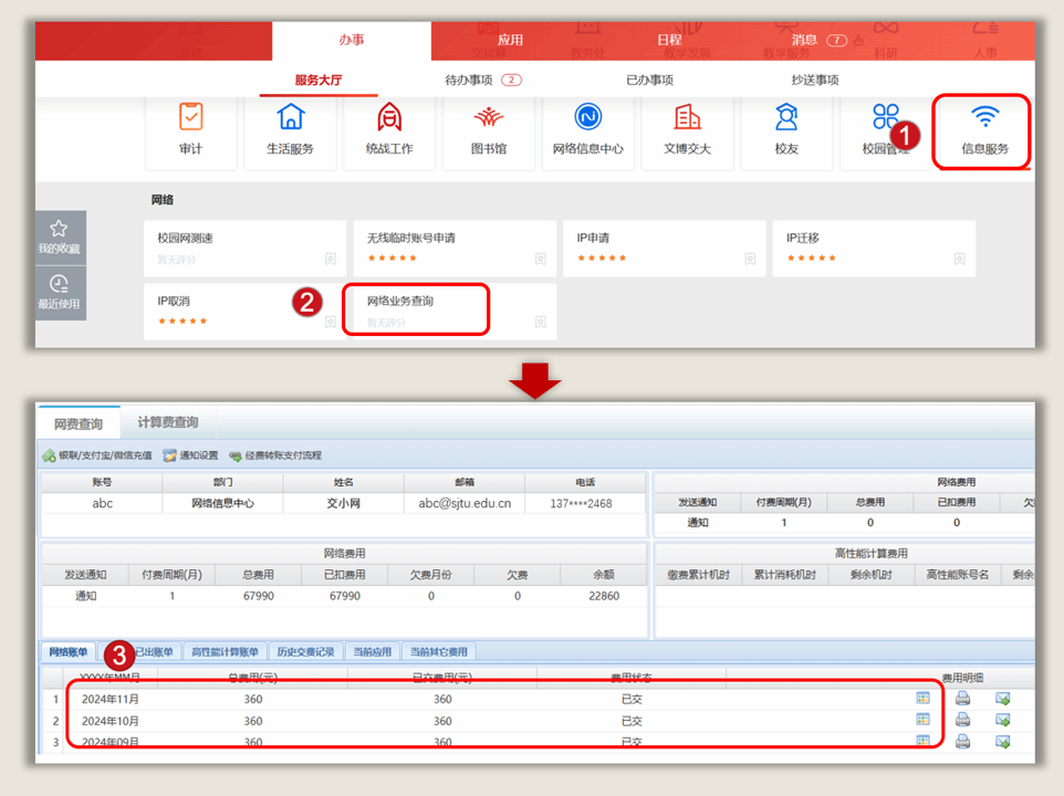 方式二:“交我办”PC版(https://my.sjtu.edu.cn)->信息服务->网络->网络业务查询->网费查询->网络账单。