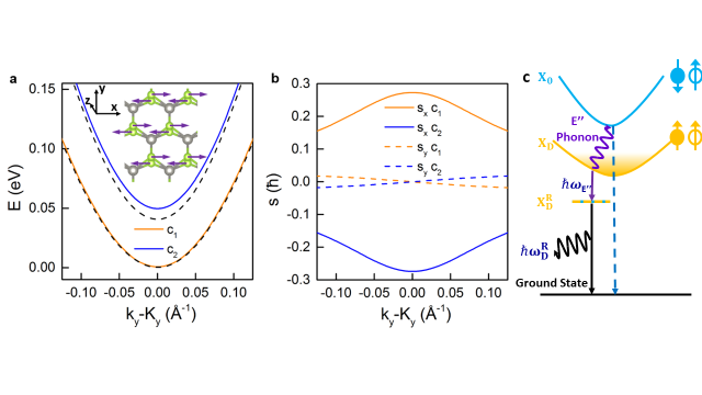 最后,我们借助第一性原理计算得出E’’模的声子能量21.8 meV,与X_D^R和X_D在光谱上的能量差21.6 meV高度重合。并通过二阶微扰理论揭示,自旋禁闭的暗激子可以通过位于Γ点手性E’’声子的相互作用,从而和自旋允许的亮激子相互耦合,同时释放一个手性声子和一个圆偏光子。