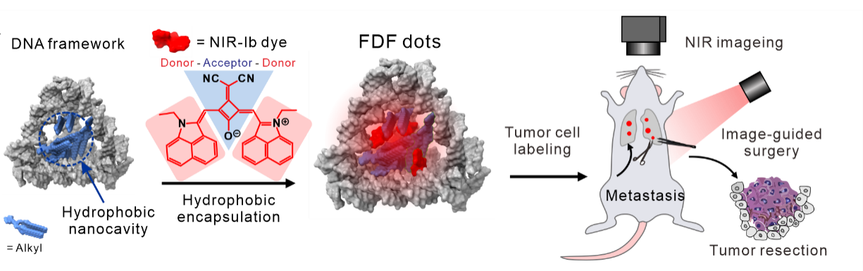为解决这些问题,研究团队基于框架核酸发展了一种通用平台,可封装各种类型的疏水性荧光染料。特别的,研究者通过将小分子荧光染料Sq964非共价封装到疏水性纳米腔中,构建了具有大小和形状分辨能力的框架核酸荧光点(FDF dots),该材料具有超高亮度、厘米级深层组织穿透性、高光稳定性和良好的肿瘤滞留率。研究团队应用该材料展示了近单细胞水平的超高灵敏NIR-II癌症成像,并成功将其应用于成像引导的微小肿瘤病灶的手术切除。